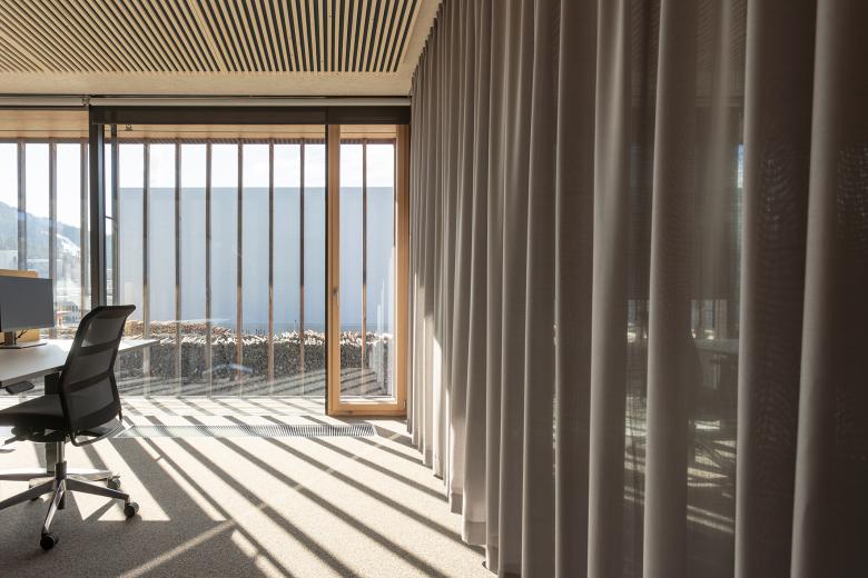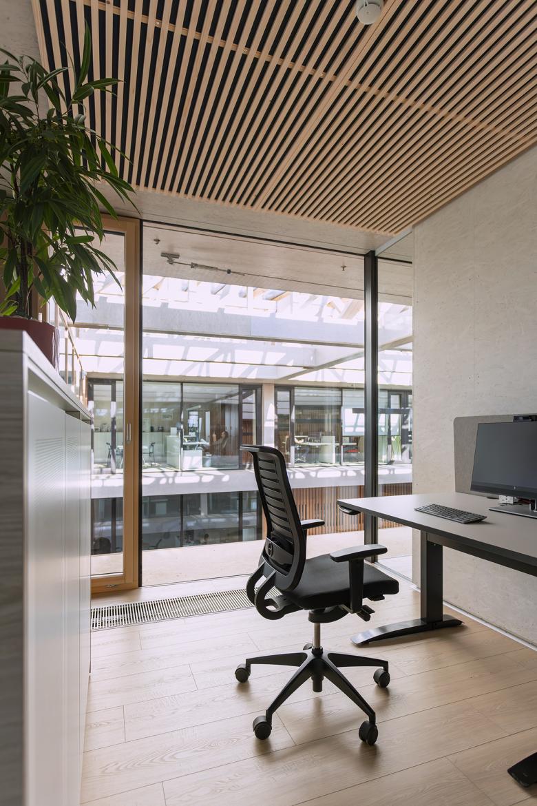 Die Hauptrolle im Erscheinungsbild der neuen identitätsstarken Arbeitsfläche spielen die firmeneigenen Produkte. Alle sichtbaren Materialien stammen aus der eigenen Produktion. Der Fußboden besteht aus hochwertigem Laminat, die Decke aus OSB-Platten wird mit abgehängten Holzlamellen kombiniert und die Zwischenwände, Tischplatten sowie Möbel sind mit dekorativen Holzwerkstoffen gestaltet. Die neugestaltete Arbeitsumgebung spiegelt die tief verankerten Werte des Familienunternehmens wider und ermöglicht es gleichzeitig, neue Arbeitsformen zu leben und zu erleben.