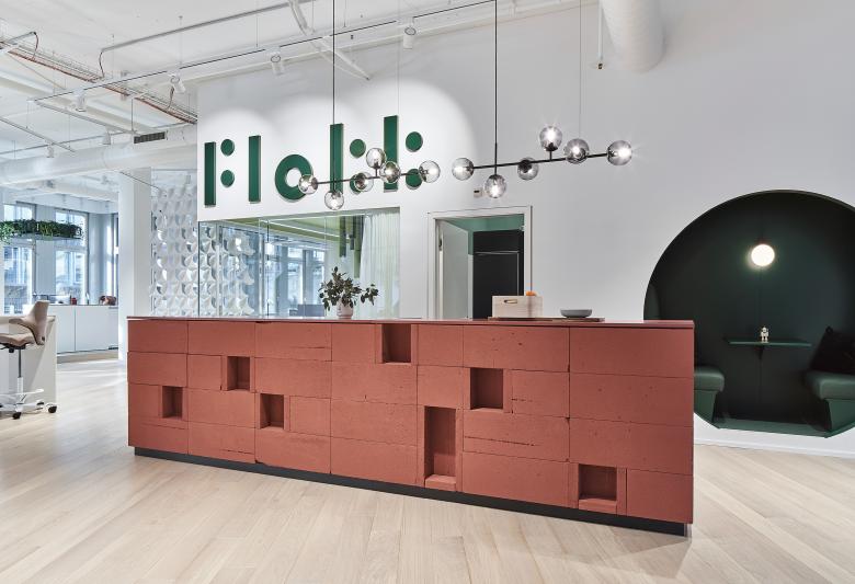Verschmelzung zweier Designkulturen – In der Gestaltung der Räume widerspiegelt sich die skandinavische Designkultur und das schweizerische Erbe (Giroflex). Das nachhaltige Designkonzept verbindet die nordische Leichtigkeit mit der eklektischen und inspirierenden Welt des urbanen Zürichs. Als stilisiertes Element und Eyecatcher entwerfen die Designer von Mint Architecture charakteristische Holzhäuser in der Form nordischer Häuserfronten und setzen darauf ein typisch schweizerisches Giebeldach. Die Holzhäuser stehen stellvertretend für die Nachhaltigkeit und Designansprüche von Flokk und dienen als Showcase zur Inszenierung hochwertiger Produkte sowie als Fläche zur Kommunikation der Firmenphilosophie. Mit Materialen, wie beispielsweise Porenbeton, wird typisches Nordic Design mit raueren Vintage-Elementen akzentuiert, wodurch eine inspirierende, helle und gleichzeitig warme und einladende Atmosphäre geschaffen wurde.