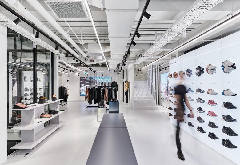 Nomen ist Omen. Das Sports House widmet sich auf vier Etagen einer Sportart oder einem Kundensegment. Unter anderem mit starken Schweizer und regionalen Brands, wie beispielsweise der Marke On in der ersten Etage. Oder mit themenspezifischen Etagen, wie der exklusiven Fitness und Yoga Welt. In der obersten Etage dominieren saisonale Themen. Im Sports House sorgen unterschiedliche Raumhöhen und Durchblicke sowie ein raffiniertes Lichtkonzept für Glanzpunkte. Helle Materialien, geometrische Linien sowie flexible Elemente und Möbel für die Warenpräsentation setzen die Brands und die Sportwelt imposant in Szene.
