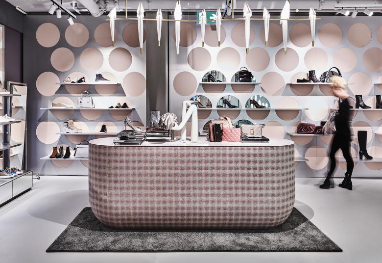 Auf jeder Etage wird die hochwertige Materialsprache zielgruppenspezifisch und thematisch interpretiert. Filigrane Systeme mit überraschenden Formen für die Warenpräsentation lassen sich flexibel kombinieren. Ein wechselndes Farbkonzept, edle Textilien und Sitzmöglichkeiten laden ein zum Verweilen und bescheren den Kund_innen sinnliche Momente.
