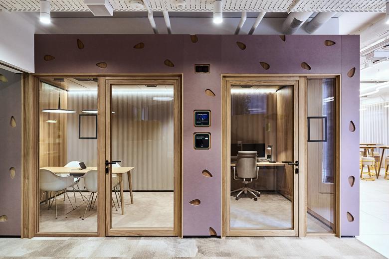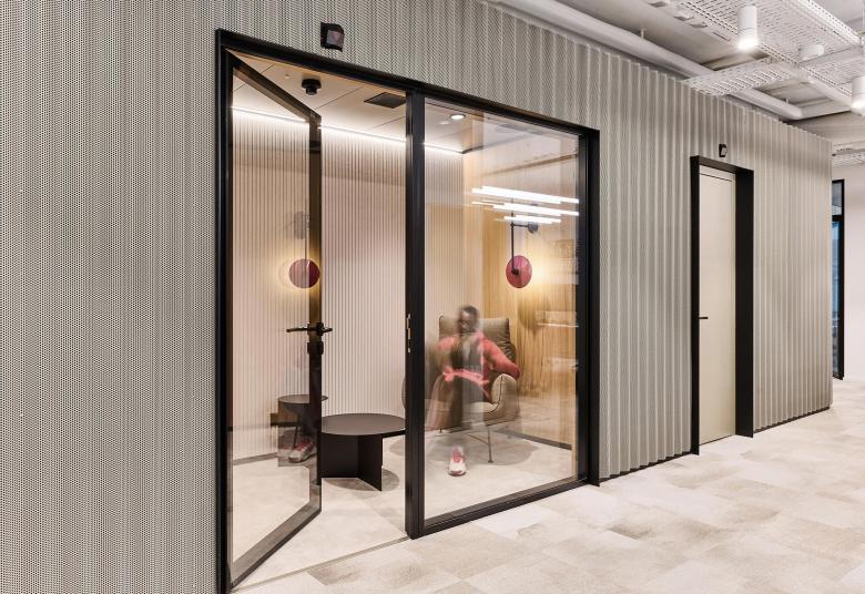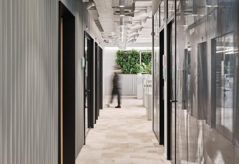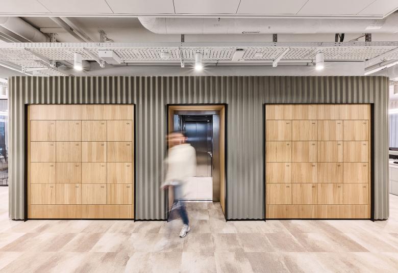 Die Innenarchitektur des neuen Hauptsitzes zeichnet sich durch eine starke Identität aus, die auf allen Stockwerken massgeblich von der Gestaltung und Materialisierung des inneren Kerns geprägt ist. Diese heben sich durch ein lebendiges Spiel von Farben und Texturen deutlich ab: Mit Wandverkleidungen aus gelochtem Wellblech, schwarz gerahmten Glastüren, Einbauten aus edlem Eichenholz und akustischen Raumelementen, die an das Restaurantdesign anlehnen, setzen sie einen wirkungsvollen Kontrast zur hellen, minimalistischen Gestaltung der Arbeitsbereiche und zu den grossflächigen Fenstern, die von weissen Fassadenelementen umrahmt werden. Es entsteht eine Arbeitsatmosphäre, welche die Unternehmensidentität von McDonald’s widerspiegelt und die gleichzeitig eine klare Abgrenzung zwischen den verschiedenen Zonen schafft.