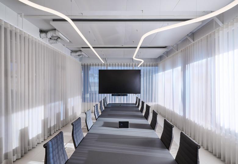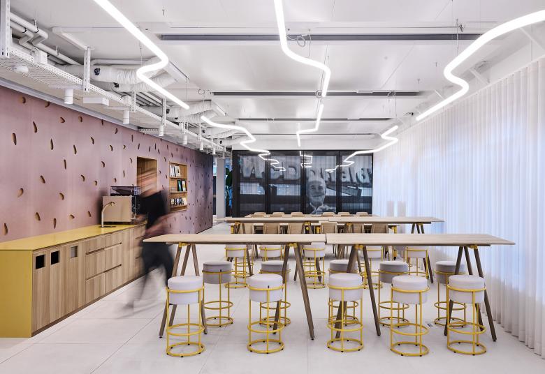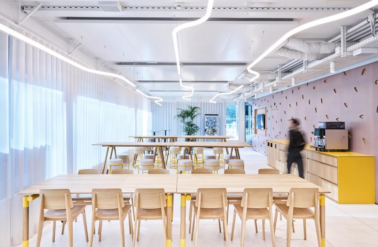 Ein Grossteil der Fläche auf der ersten Etage gestaltet sich als Gemeinschaftsraum. Herzstück und Treffpunkt ist die moderne Kantine, die Mitarbeitenden und Gästen eine grosszügige Kaffeetheke, eine komplett ausgestattete Küche und viele Sitzgelegenheiten bietet. Auf der einen Seite schliesst sich ihr eine offene Aussenterrasse an und auf der gegenüberliegenden ein grosser Meetingraum mit modernster Präsentationstechnik. Dank mobiler Trennwände und Vorhängen lässt sich diese dreiteilige Zone zu einer grossen Eventfläche verbinden und für Firmenanlässe nutzen. Auf der gegenüberliegenden Seite eröffnet sich den Mitarbeitenden ein Open Space Arbeitsbereich mit offenen und geschlossenen Meetingräumen, einem Workshopraum und Fokusräumen.