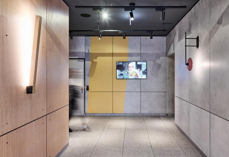 Die in den Workshops definierten Design Stories werden in der Innenarchitektur aufgegriffen und im Look & Feel atmosphärisch umgesetzt. Eine wichtige Gestaltungsgrundlage bilden die CI-Farben gelb, rot und die durch die Bepflanzung grünen Farbkontraste sowie Elemente aus den Designkonzepten der Restaurants, die in einem neuen Kontext eingesetzt werden. Dazu gehört beispielsweise der gelbe Beleuchtungskörper in der überhohen Begegnungszone im dritten Obergeschoss, der vor einer rotgestrichenen Deckenfarbe inszeniert wird. In den räumlich anschliessenden Open Space Bereichen kommunizieren Green Walls das Thema Nachhaltigkeit. Schwarzweiss-Fotos an Glastüren und Glaswänden dienen nicht nur dem Sichtschutz, sondern erzählen die Unternehmensgeschichte entlang des aktivierten Gebäudekerns. Der Einsatz echter und langlebiger Materialien, kleine feine Details in der Möblierung sowie die gelb befugten weissen Keramikfliesen im Toilettenbereich schaffen eine spielerische, moderne und warme Arbeitsplatzatmosphäre.