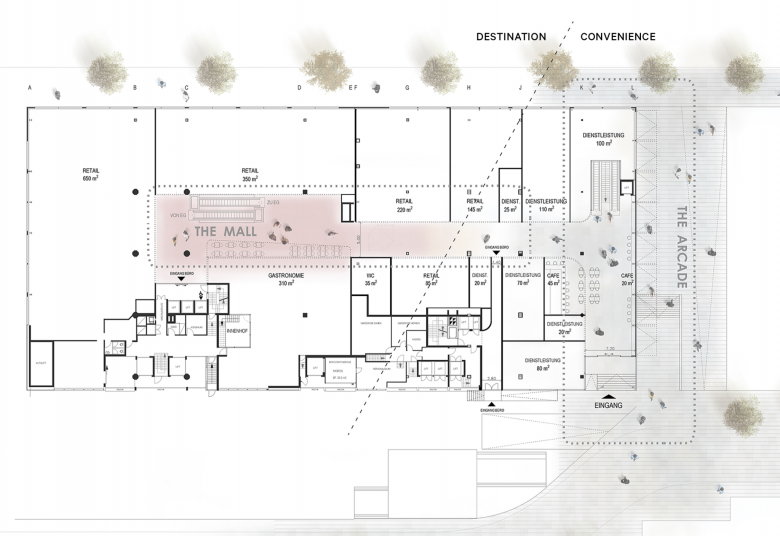 Besucherstrom besser lenken – Mithilfe der von Mint Architecture entwickelten Tools werden in einem ersten Schritt die verschiedenen marktrelevanten Kriterien analysiert und beurteilt. Die Auseinandersetzung mit dem Standort zeigt, dass zwar zwischen dem Bahnhof und dem Vadianplatz mit seinen Finanzinstituten ein hoher Besucherstrom besteht, die Passant_innen jedoch vornehmlich die schmale Gutenbergstrasse benutzen. Als Gründe dafür werden die schlecht sichtbaren Eingangsbereiche sowie die umständliche und verwirrende Mallführung identifiziert, wodurch den Betreibern ein wichtiger Anteil an potenziellen Besucher_innen verloren geht. Dabei handelt es sich vornehmlich um Pendler_innen und auswärtige Geschäftsleute, die in der Umgebung arbeiten.