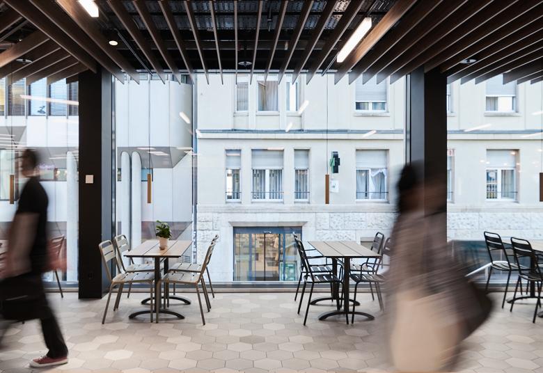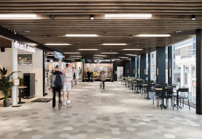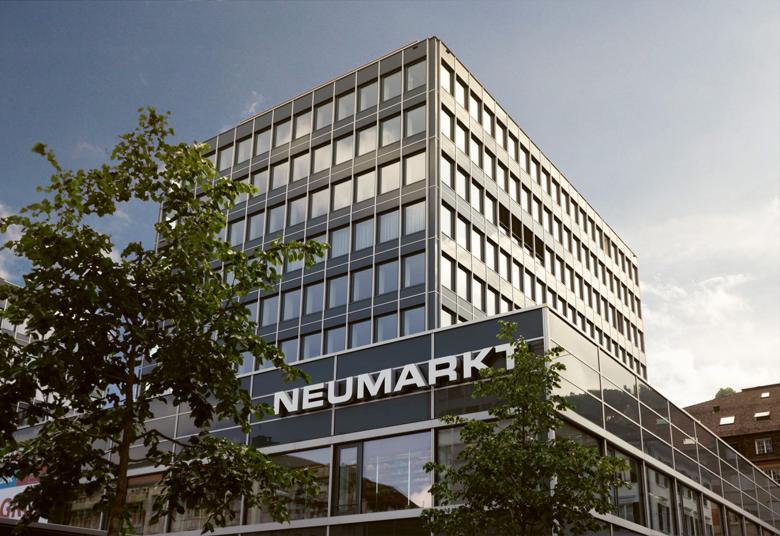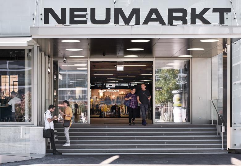 Erlebnis ins Zentrum gerückt – Künftig führt kein Weg am Neumarkt 1&2 vorbei. Dafür sorgen eine neu verglaste Aussenfassade und der vergrösserte Eingangsbereich. Dadurch werden auch die Seitengänge besser betont und Einblicke ins Innere gewährt. Dadurch werden die Besucher_innen intuitiv ins Zentrum und zur Piazza geführt. Bei der Gestaltung der Mall sorgen natürliche Farbtöne und Texturen, eine durchgängige Lammelendecke aus Holz, schlicht gestaltete Shopfronten sowie eine dezente Beleuchtung für eine Atmosphäre, die den hektischen Alltag für einen Moment draussen lassen. Einen besonderen Akzent setzt der Fussboden aus hexagonischen Keramikplatten, der die unkomplizierte und einladende Atmosphäre prägt.