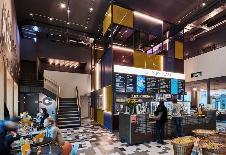 Die drei unterschiedlich inszenierten Balkongeschosse nehmen in Farben und Einrichtung Bezug zu Kinoklassikern sowie zur Umgebung des Hauses und begeistern mit schönen Einzelanfertigungen. Wertige Schreinerarbeit für Tische, Sitzbänke und Einbauten mischen sich mit zeitlosem dänischen Möbeldesign und Einzelstücken aus dem Brokenhaus. Sie sorgen im Lilly Jo Plaza für eine lebhafte Atmosphäre.