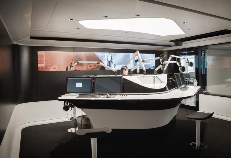 Die Medienwelt erleben – Im Erdgeschoss geben die bodenlangen Fenster den Blick frei ins Innere des Medienhauses mit drei eigenständigen Bereichen. Als erstes angezogen werden die Vorbeigehenden vom Radio Energy Flagship Studio an Passantenlage. Im Innern schliesst das Radiostudio direkt an das Café «The Studio» an, in dem die Gäste den Moderator_innen bei der Arbeit zusehen können.