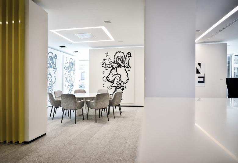 Das umgestaltete Foyer bildet den dritten Bereich. Hier wurde mit einem Empfangsdesk vom berühmten britischen Objektkünstler Liam Gillick die Begegnungszone «The Gallery» geschaffen. Sie ist Treffpunkt für Mitarbeitende, Wartebereich für Gäste, Meeting-Location und Kunstgalerie für Exponate aus der Sammlung Ringier. Diese Kunden- und Begegnungszone wird von Mint Architecture entworfen und zusammen mit dem Radiostudio und dem Gastrobereich zu einem architektonischen Ganzen zusammengeführt. Sich informieren, konsumieren, verweilen, sich treffen und geniessen: Dies alles ist im neuen Medienhaus möglich.
