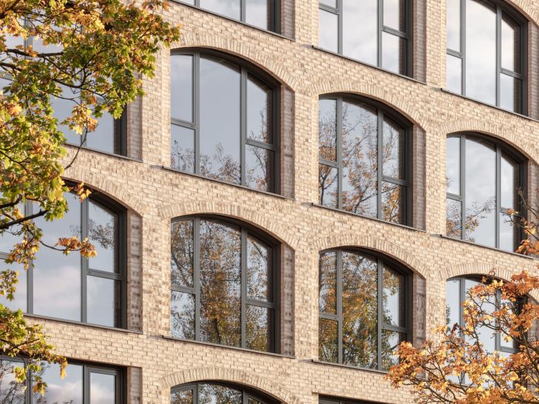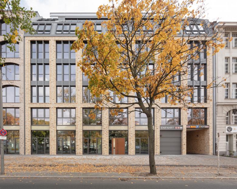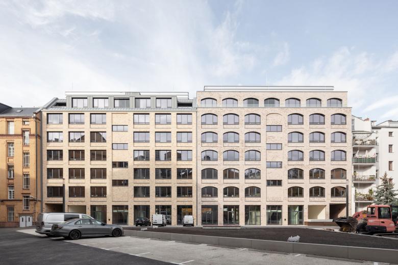 Der Berliner Bautradition folgend sind die Hofseiten reduzierter gestaltet, mit kleineren Fensteröffnungen und einer Wärmedämmverbundsystem-Fassade mit Klinker-Riemchen im gleichen Farbspektrum wie die Straßenfassaden.