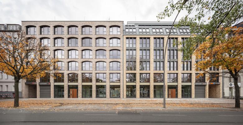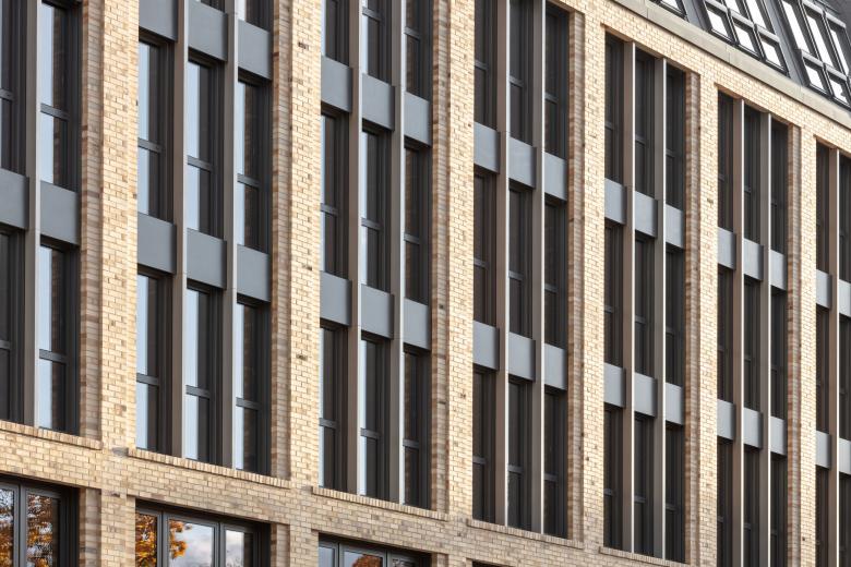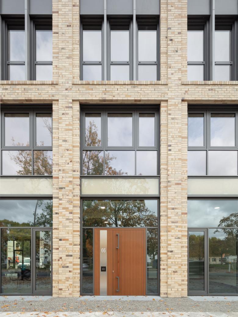 Die Normalgeschosse der Gebäudeteile erhielten unterschiedliche, beige-bunte Fassaden aus Klinkermauerwerk mit differenzierten Gliederungen. Der straßenseits rechte Bauteil wurde mit einer zweigeschossigen Sockelzone und einem dreigeschossigen, vertikal gegliederten Mittelbereich versehen, an die der wiederum zweigeschossige Dachbereich mit einem Titanzink-Schrägdach anschließt. Das linke Gebäude besitzt ebenfalls einen doppelgeschossigen Sockelbereich, darüber allerdings ein Mittelbereich über vier Geschosse mit verglasten, großformatigen Fenstern in Segmentbögen als Referenz an die industrielle Frühmoderne. Dieser Gebäudeteil erhielt ein Staffelgeschoss mit einem Flachdach.
