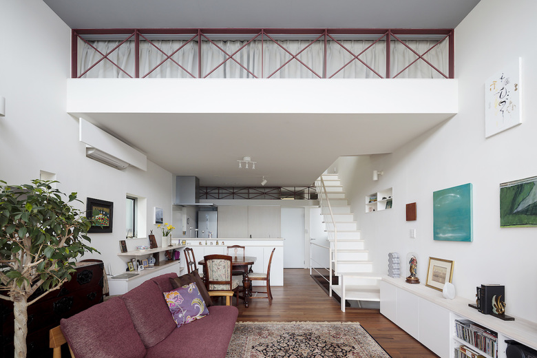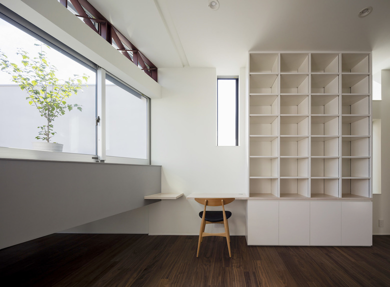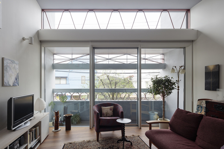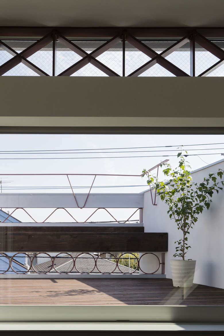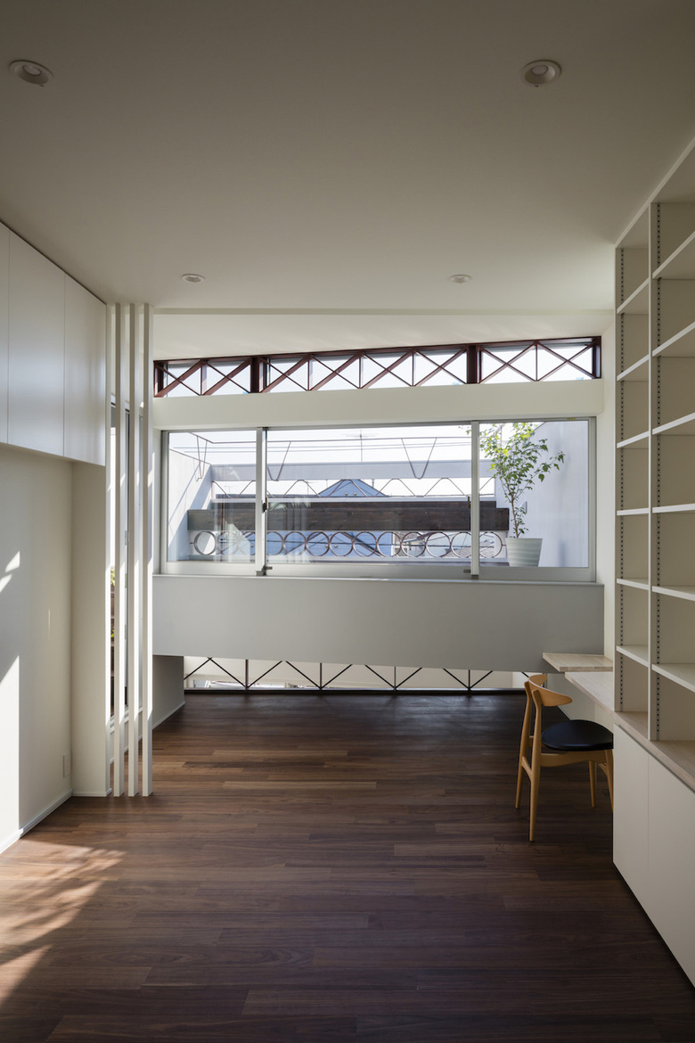 In typical Japanese wood-frame architecture, load-bearing walls are necessary between the beams, with a particularly large number needed on lower floors. This leads to a partitioning of space. Using a wooden portal-style Rahmen frame toward the front of the building rendered load-bearing walls unnecessary, but the columns also had to be widened, crowding the narrow facade. To allow for narrower columns, the top-to-bottom height of the beams had to be increased, but ordinarily that would close off the space. Our design solution was to create a Rahmen frame using composite beams made of steel trusses and laminated lumber, which allowed for both narrower columns and long lines of site, ultimately creating a greater feeling of openness in the space.