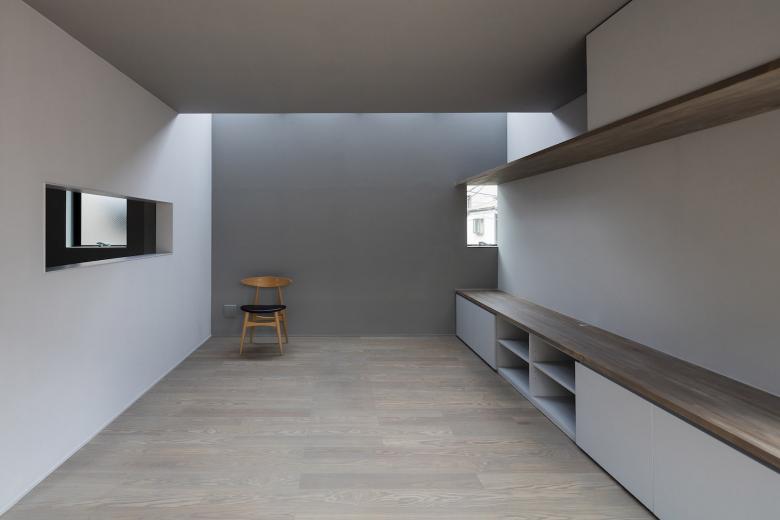 The mother occupies the first floor, while her son, his wife, and their child are on the second and third floors. The third floor was handled as a single volume containing private areas such as the master and child’s bedrooms and the bathroom. The first floor was also treated as a single volume offset from the third-floor volume so as to open up space for a terrace on the first-floor roof. In between these two volumes, the second floor is bounded by two continuous surfaces that fit together like puzzle pieces, embracing an open living room that is integrated with the terrace.