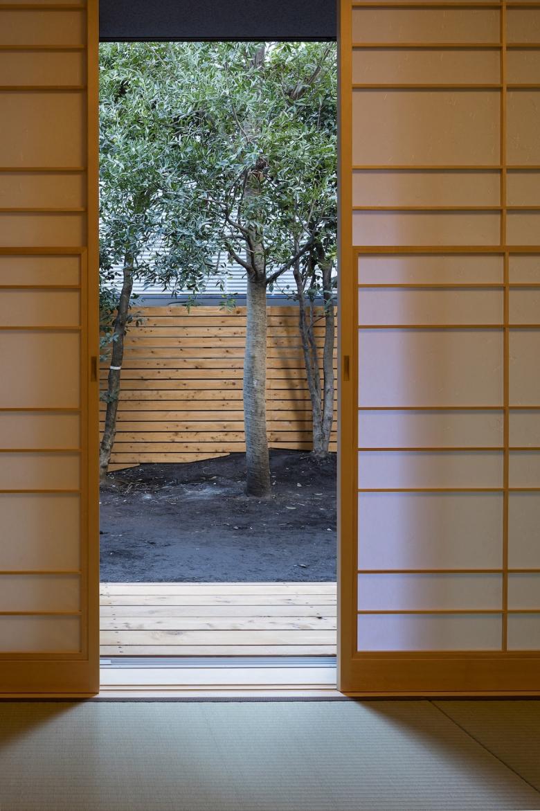 Trees planted along the elevated edge of the roof further shield the home from the third floor of the apartment building and bring dappled light inside, allowing the residents to enjoy the shifting patterns of light and greenery.