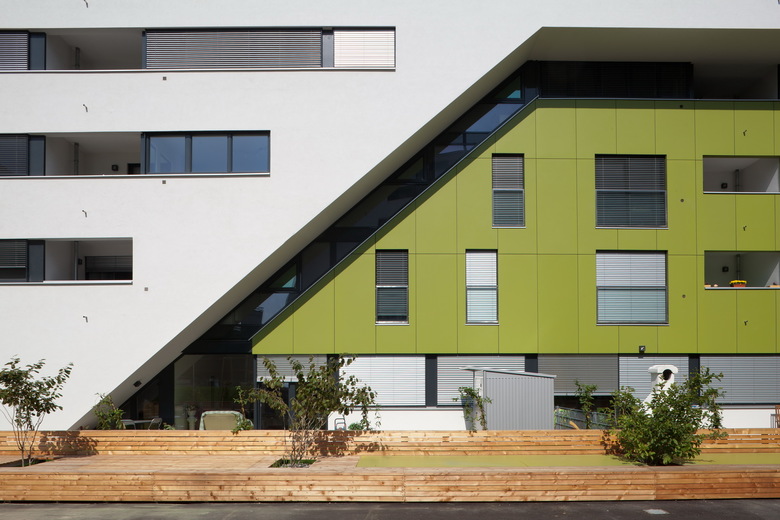 Durch die schiefwinkelige, differenzierte Form wirkt der Baukörper trotz seiner Masse erstaunlich leicht und dynamisch. Diese Wirkung wird durch die lineare Staffelung der Fassade und den Materialwechsel von weißem Putz und grünen Eternitplatten verstärkt.