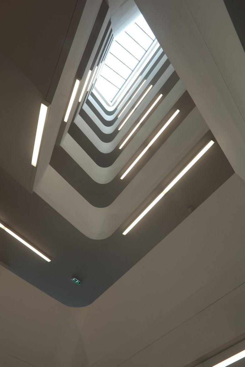 Die natürliche Belichtung ist ein Grundgedanke des Konzepts. Daraus ergeben sich die charakteristische Form der angeschrägten Seitenflügel und der verglaste Sockel mit den Gemeinschaftsräumen; vertikale Einschnitte leiten das Tageslicht bis tief in den Baukörper hinein.