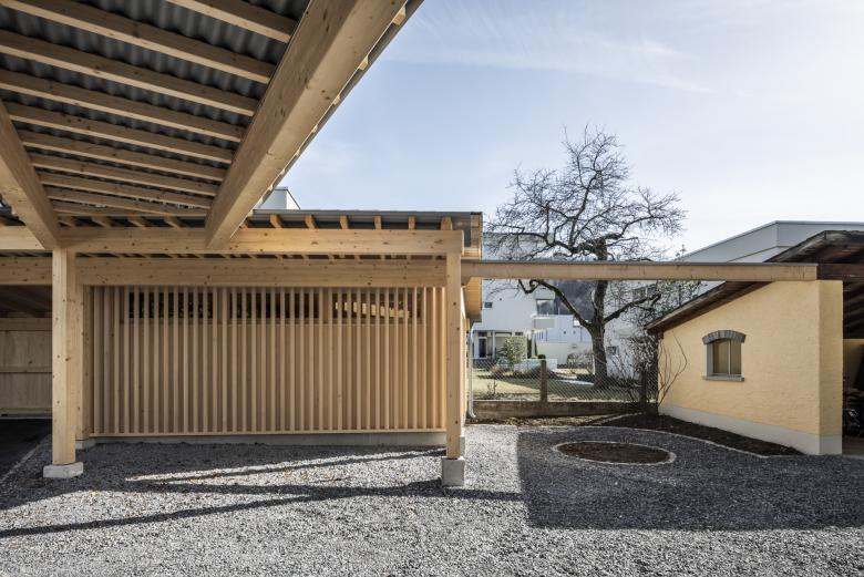 Geräteraum und Unterstand für Velos und zwei Autos.
