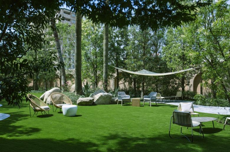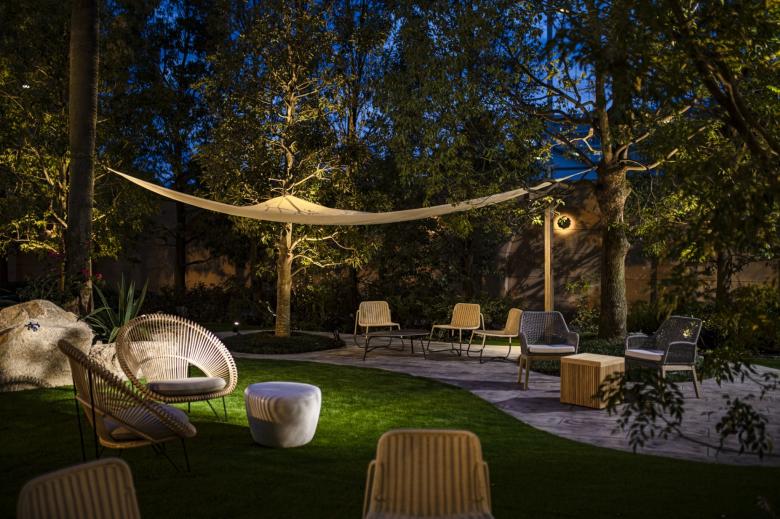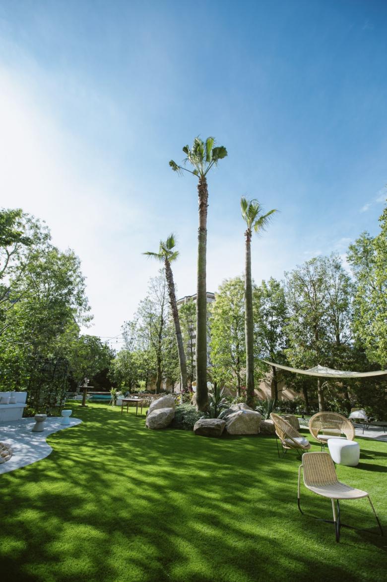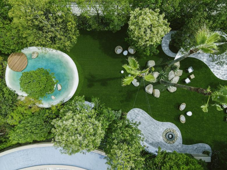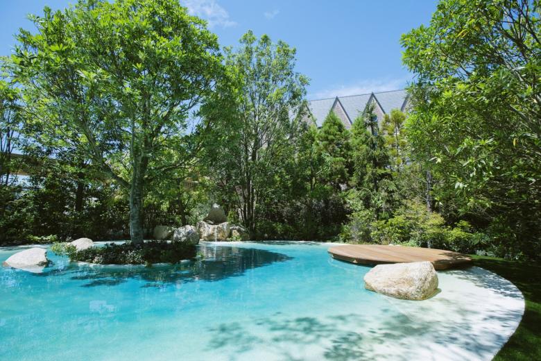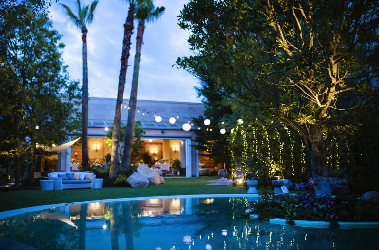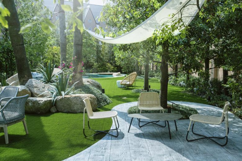 Durant la renovació d'aquest jardí, el primer que vam buscàrem, va ser crear una sensació de separació de l'entorn utilitzant abundant vegetació. També preteníem crear una atmosfera d'hotel exòtic instal·lant un estany de gradació blava per a representar la mar poca profunda dels països tropicals; i disposant bancs d'arc llarg, palmeres i pedres del tipus que es veu a Los Angeles.