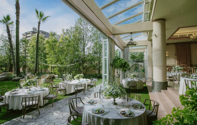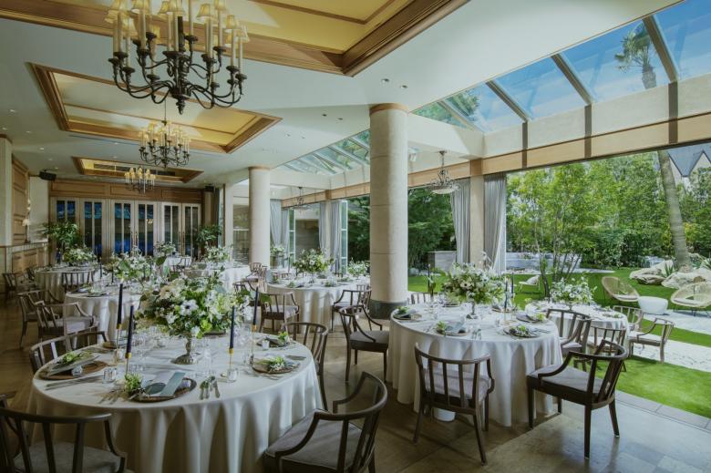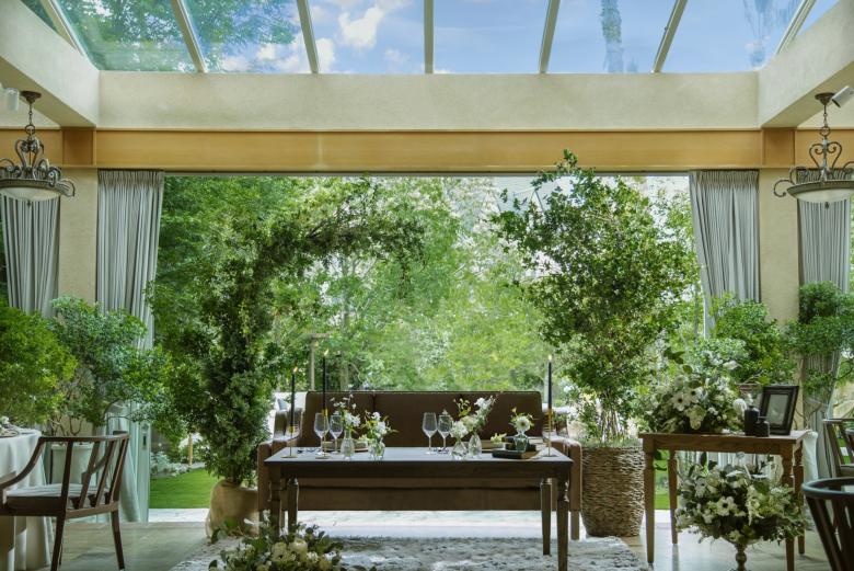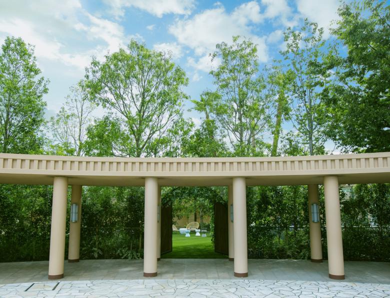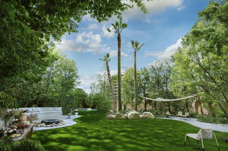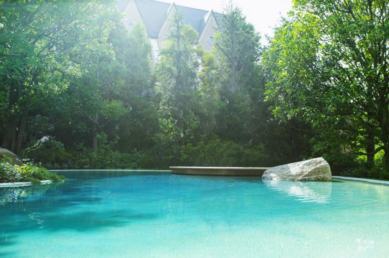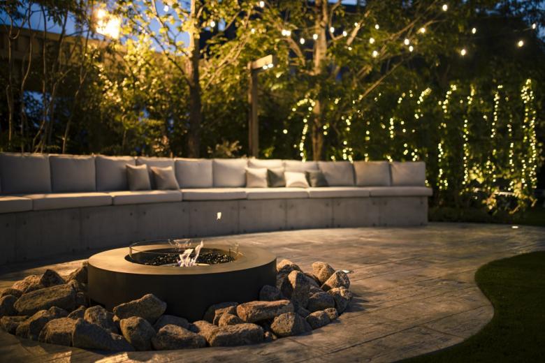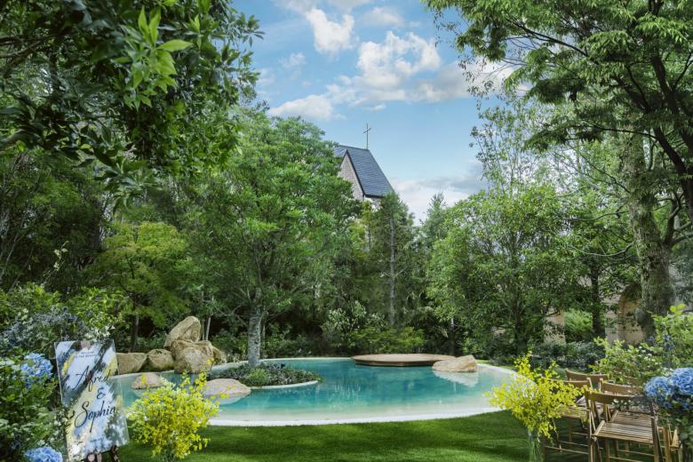 Durant la renovació d'aquest jardí, el primer que vam buscàrem, va ser crear una sensació de separació de l'entorn utilitzant abundant vegetació. També preteníem crear una atmosfera d'hotel exòtic instal·lant un estany de gradació blava per a representar la mar poca profunda dels països tropicals; i disposant bancs d'arc llarg, palmeres i pedres del tipus que es veu a Los Angeles.