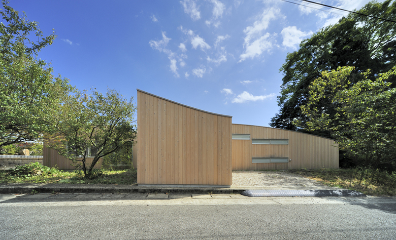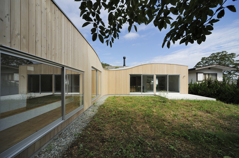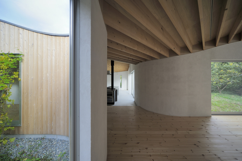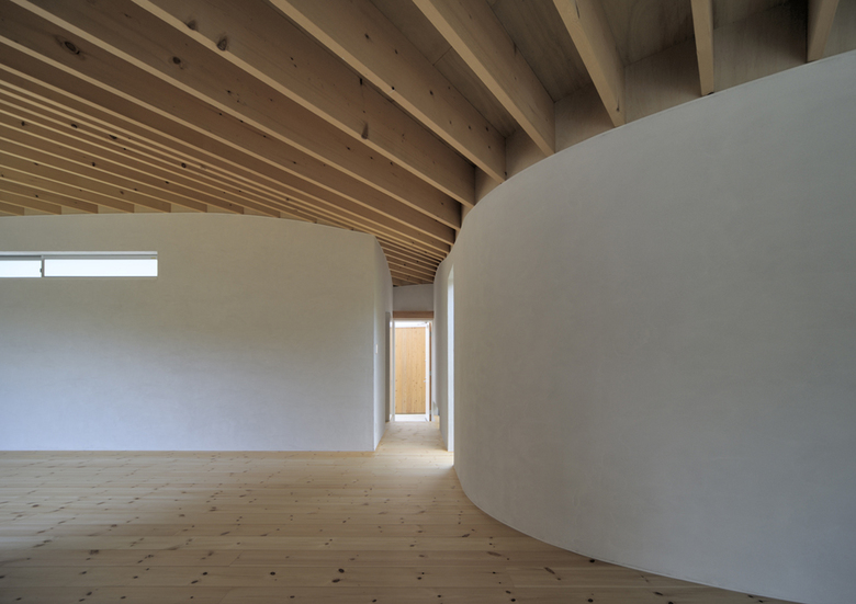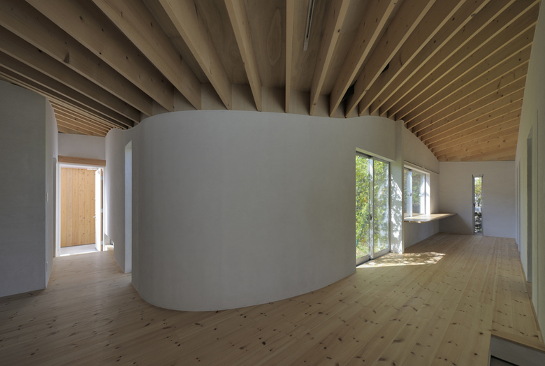 施主は夫婦+子供一人。市街地でのマンション暮らしをやめ、緑豊かな山あいの環境に新しい住まいを求めた。建物の中と外をつなげて使いたいという施主の希望からキッチンなど内部床の半分近くがコンクリート土間である。屋根架構は、水平架材の高さを微妙に変えることで緩やかな曲面を作り出している。