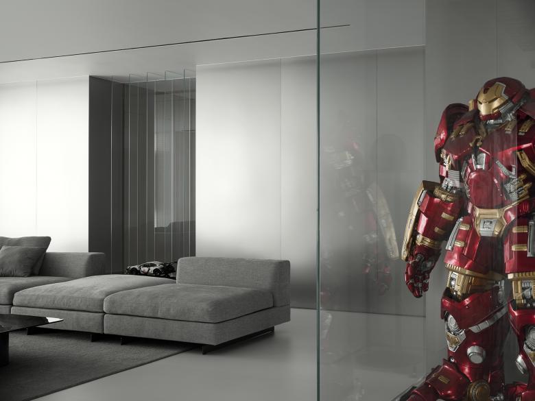 The 8-meter-long transitional space at the entrance not only links living room with dining room, but also effectively enhances the experience. Terrazzo extending from floor to wall strengthens a sense of boundary, making distinct areas clear. Upon opening the door, the occupant can immediately experience a free spatial ambience. Artworks on the wall help guide the circulation route. In the center, there's an artistic and trendy toy inside a glass box — a huge Hulkbuster armor. This glass box allows the owner to place his favorite objects, generating a strong display effect and voicing his personality as well.