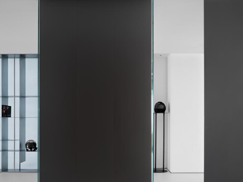 Open layout, coupled with minimalist restrained aesthetics and large areas of blank surfaces, reveals a sense of serenity and inclusiveness. White color shades produce a background for highlighting the owner and his hobbies, and also create a calming home that evokes a restrained state of mind, sensitive yet pure emotions and a minimalist lifestyle, which cater to the personality of the occupant.