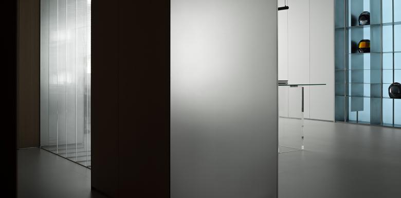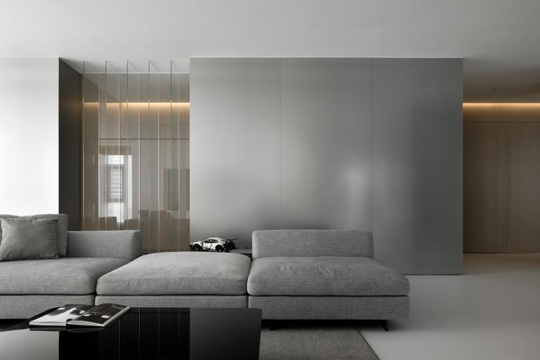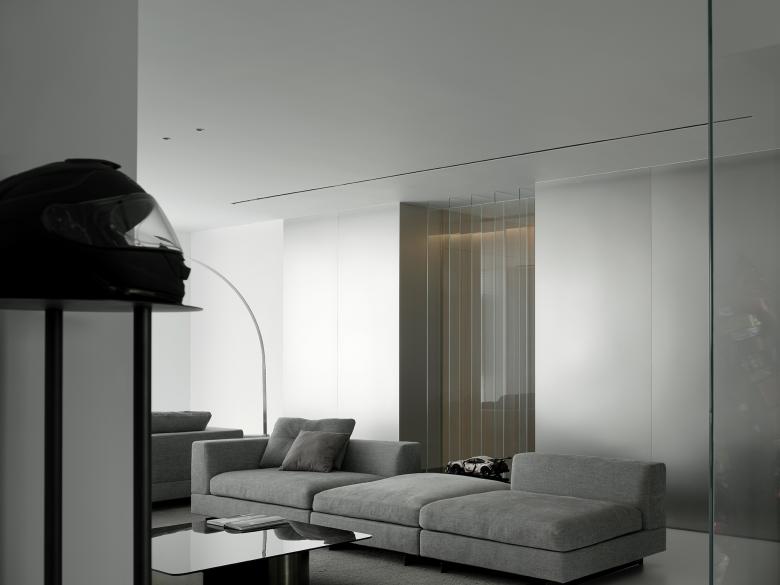 Sofa area, together with open study, display cabinet, bar counter, car racing simulator and tea bar, forms an open spatial realm. Functional areas are distinguished by glass boxes and the floor's height difference, without absolute division. The design aims to create a free and relaxing flowing space to enhance interaction in between different functional areas.