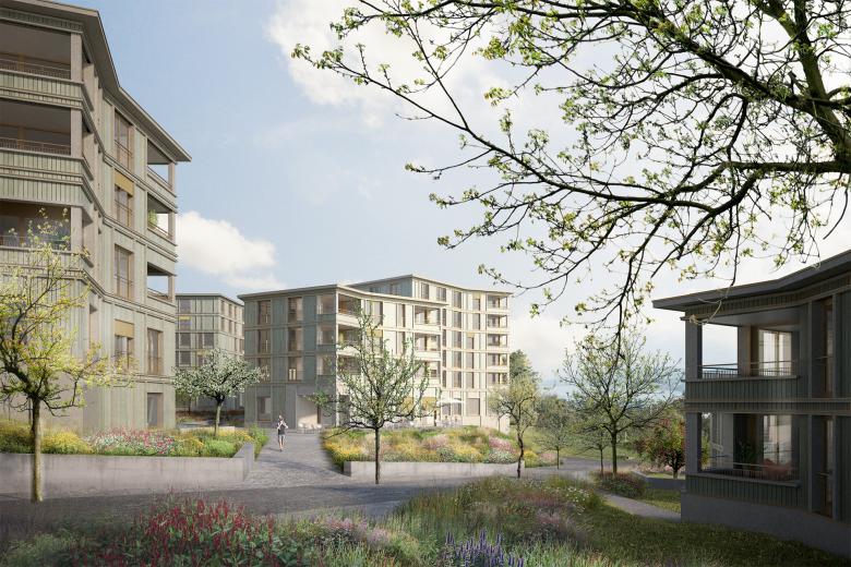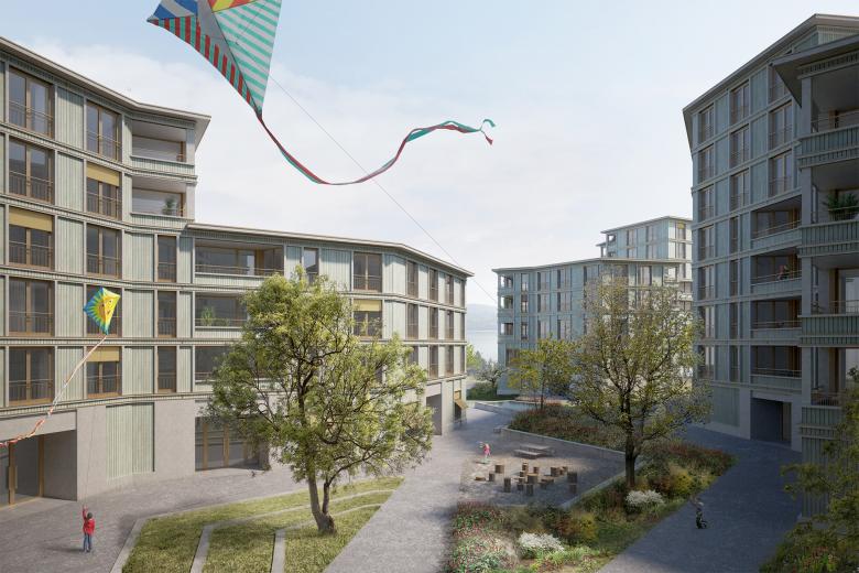 Die Siedlung profitiert von einer aussergewöhnlich hochwertigen Lage. Am Rand von Horgen, hoch über dem Zürichsee gelegen öffnet sich von Nordosten bis nach Süden hin ein fantastischer Ausblick auf den See und die Alpen. Die Gebäude liegen parallel zum Hang und definieren in ihrer Mitte einen zentralen Aussenraum. Es sind acht unterschiedliche, stark gegliederte Baukörper entstanden, welche die Gebäude mit der Landschaft verzahnen. Ein abwechslungsreiches System aus Rampen und Stützmauern machen die steile Topografie zu einem wichtigen Thema innerhalb der Siedlung. In ihrer Gesamtheit generieren die unterschiedlichen Bauten eine Abfolge von verschiedenen Freiräumen mit angenehmen Proportionen, differenzierten Raumsequenzen und spannenden Blickbezügen. Durch die gestalterische Akzentuierung bilden sich unterschiedlichste Orte mit hoher Aufenthaltsqualität für die Bewohner der Siedlung und des Pflegezentrums.