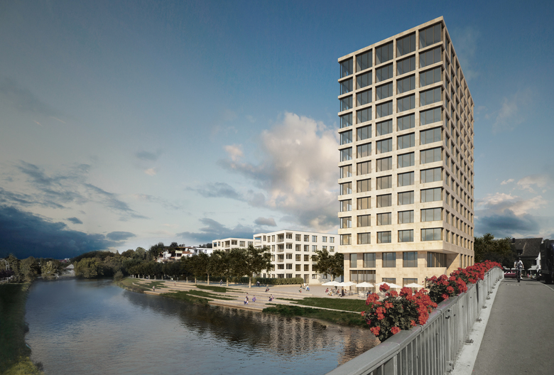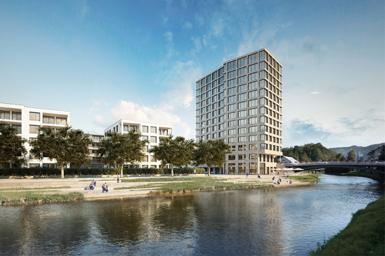 Das Stadthausareal von Adliswil ist geprägt durch seine einmalige Zentrumslage direkt an der Sihl. Aber während einerseits der Standort am Ende der Bahnhofbrücke so einzigartig ist, zeigt sich andererseits die umgebende Bebauungen höchst heterogen und zufällig. Das vorliegende Projekt greift die verschiedenen vorhandenen Strukturen auf und verbindet sie zu einem neuen Ganzen. Zwei 5 geschossige Punkthäuser an der Sihl führen die typische kleinkörnige Ufer- bebauung weiter. Das 5 bis 6 geschossige, strassenbegleitende Langhaus mit überhohem, zurückversetztem EG definiert und stärkt den Strassenraum und verbindet sich durch seine Volumenausprägung mit der gegenüberliegenden Bebauung. Das Turmhaus am Brücken- kopf schliesst das Ensemble ab. Gleichzeitig dient es im Stadtbild von Adliswil als städtebauliche Landmarke. Das Haus setzt sich selbstbewusst von den angrenzenden Gebäuden ab, fügt sich aber durch seine Setzung und seine differenzierte Volumetrie gut ins Stadtgefüge ein. Direkt in der Sichtachse gegenüber des Bahnhofplatzes gelegen dreht die Westfassade das Turmhauses nach Westen ab und spannt so über die Sihl hinweg den städtebaulichen Bogen vom Bahnhof- zum Stadthausareal.