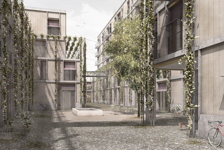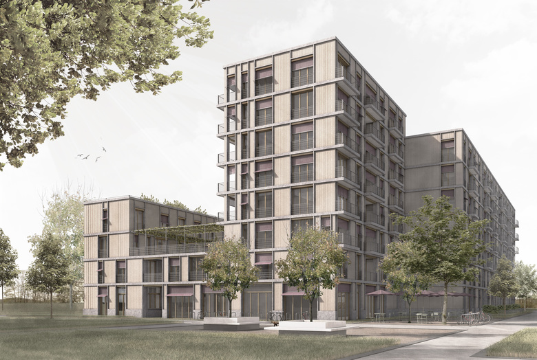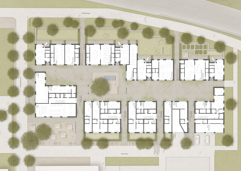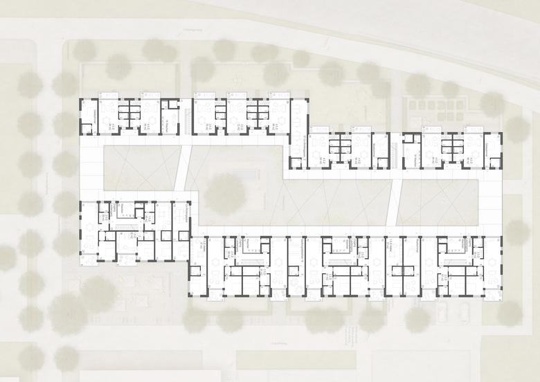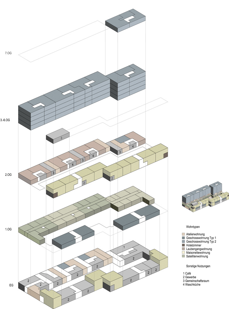 Der Neubau besteht im Wesentlichen aus zwei verschieden hohen, parallelen Gebäudezeilen. Dazwischen entsteht ein gassenartiger Raum, der an den Enden durch zwei kleine Querbauten zu einem Hof geschlossen wird. Da die Zeilen an unterschiedlichen Stellen quer verspringen, weitet sich die Gasse im Zentrum zu einem kleinen Platz. Mit seinen vier grosszügigen, zentralen Treppenhäusern prägt der östliche Hauptbau die organisatorische Struktur der ganzen Siedlung. Die unterschiedlichen Nutzungen sind horizontal übereinandergeschichtet. Es gibt reine Wohn-, Gewerbe-, Duplex- oder Clustergeschosse. Die grossen Gemeinschaftseinrichtungen befinden sich im Erdgeschoss. Die beiden Gebäude besitzen hofseitig im 2. Obergeschoss einen breiten Laubengang. An den Gebäudeenden verbinden zwei Querbauten die beiden Laubengänge zu einer umlaufenden, offenen Erschliessungsebene. Auf dem Dach der westlichen Zeile ist ein Garten geplant, der am nördlichen Ende in einer Orangerie seinen Abschluss findet. Es wird den Bewohnern ermöglicht ihre individuellen räumlichen Vorstellungen und Bedürfnisse auszuleben. Es wurden gut funktionierende, vielfältig nutzbare aber auch hochgradig familientaugliche Wohnungen geplant.