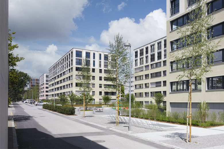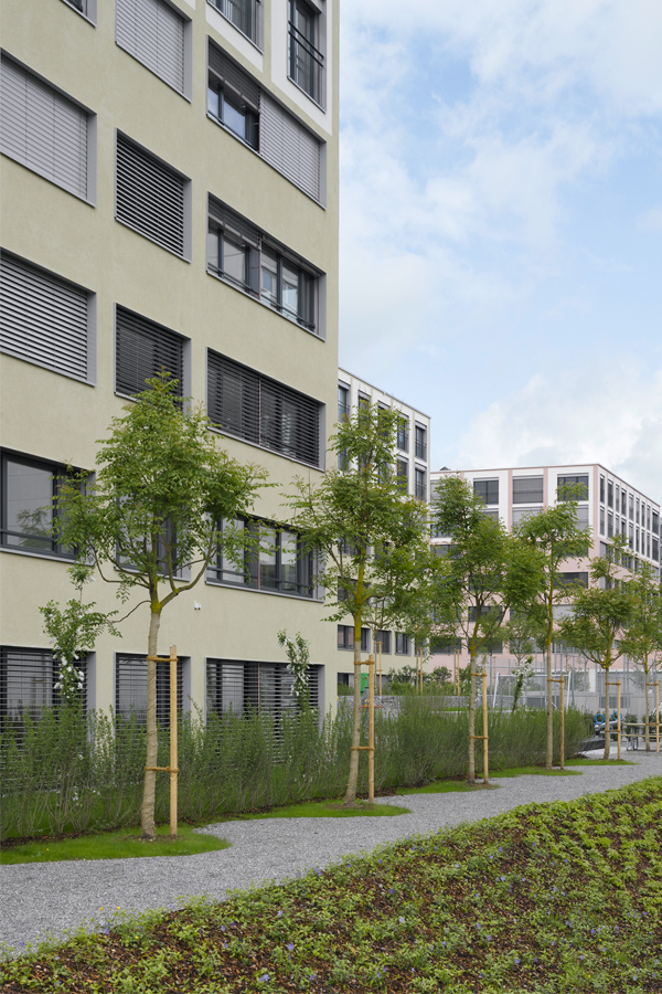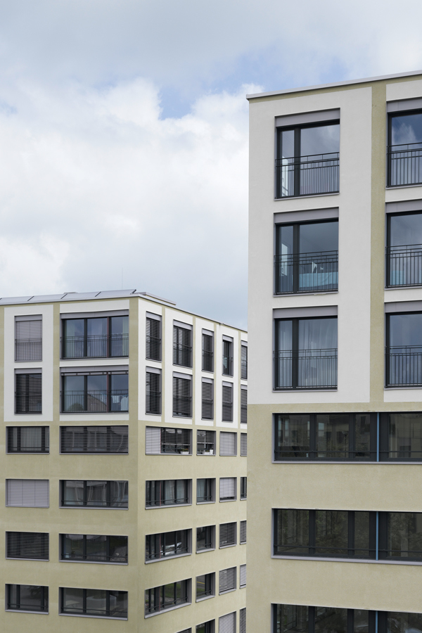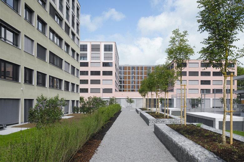 Ein Streifen entlang der Schaffhauserstrasse ist durch niedrige, flächige Gebäudeteile des bestehenden Bürohauses und rechwinklig zur Schaffhauserstrasse situierte, höhere Gebäude und Gebäudeteile besetzt. Auf diese Situation wird im Projektierungsbereich A analog mit einem eingeschossigen, sich flächig ausdehnenden Gebäudesockel und zwei unterschiedlich hohen, darauf aufgesetzten, ebenfalls rechtwinklig zur Strasse stehenden Volumen reagiert. Diese Disposition belässt und unterstützt den Charakter des Strassenraumes und weist auf eine Entwicklung der Bebauung in die Tiefe des angrenzenden Gebiets hin. Die bestehende Bebauung süd-östlich der Werkstrasse ist geprägt durch ungleich grosse, gleichgerichtete Baukörper. Auch hier wird dieses städtebauliche Grundmuster aufgenommen und weitergeführt. Es entsteht zu den bestehenden Gebäuden eine selbstverständliche Stadtergänzung und die beiden charakteristisch unterschiedlichen Teile, nämlich der Streifen entlang der Strasse und das in die Tiefe greifende Gebiet verbinden sich stadträumlich auf natürliche Weise.