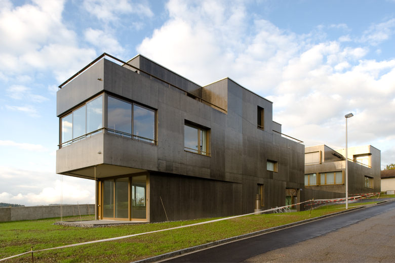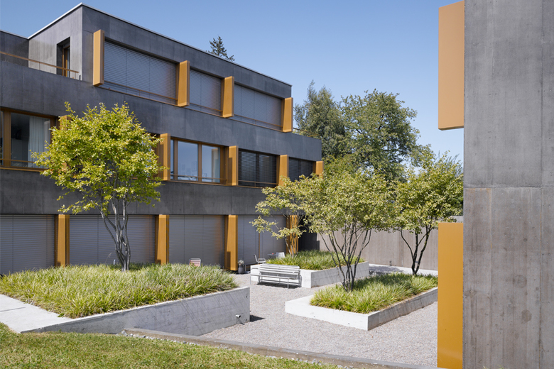 Bezugnehmend auf die unvergleichliche Aussichtslage an erhöhter, prominenter Position und die Lärmproblematik richten sich die Wohnungen auf das nördliche Greifenseegebiet, die südliche Landschaftskammer und die Alpen im Osten aus; gleichzeitig haben sie Anteil am ruhigen, identitätsstiftenden Hof. Der Hauptzugang, wo sich auch die Besucherparkplätze befinden, liegt am topographisch richtigen Ort und führt zur leicht vom Hofniveau abgesetzten Verbindung der Häuser Ost und West. Kleinwüchsige Bäume gliedern den Innenbereich. Die übrige Umgebung wird in lockerer Weise mit Bäumen besetzt. Ausser den zugeteilten Sitzplätzen vor den Wohnzimmern in den Erdgeschossen sind grundsätzlich alle Umgebungsbereiche allgemein zugänglich, die gegenseitige Rücksichtnahme der Bewohner kann vorausgesetzt werden.