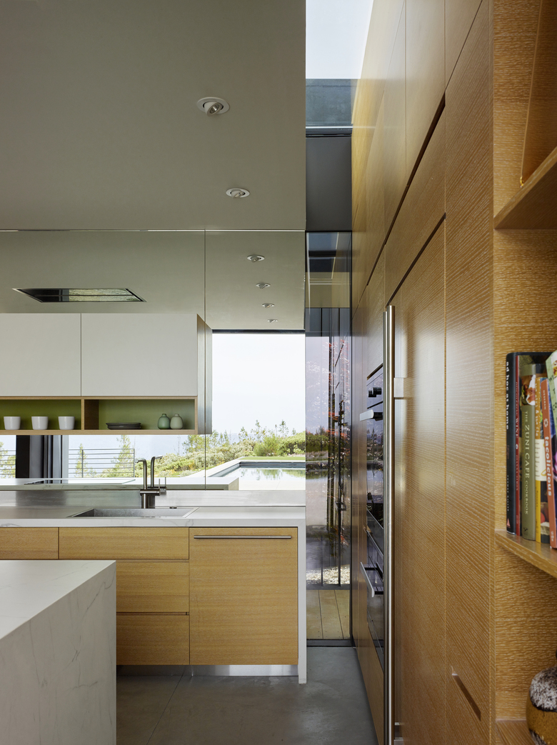 Both of the North and the South ends of the glass pavilion open up to the exterior with walls that retract and floors and roofs that hover over the descending terrain. These decks provide welcome exterior space that is shaded from the searing summer sun for both public and private spaces. Stretching naturally South along the length of the adjoining contours is a pool and exterior cooking area. With the walls retracted, the home takes on the character of an open pavilion, providing ample space both inside and out for cooking, dining, and swimming.