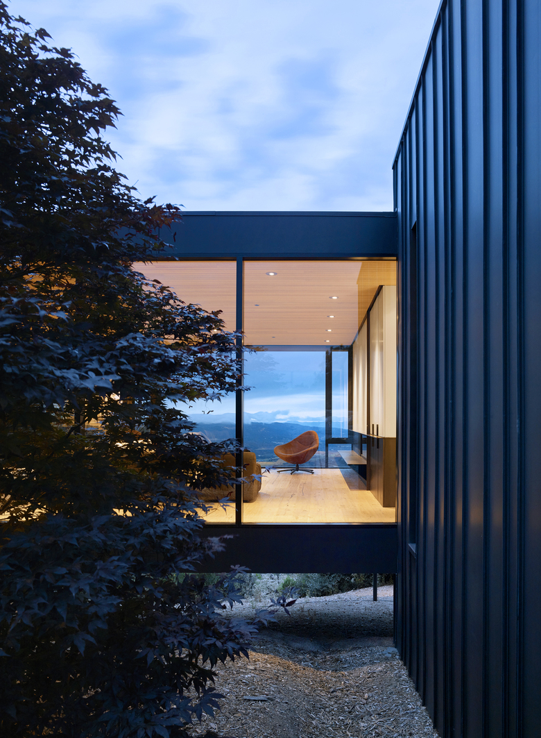 The intent was to design an extremely restrained home both in scale and cost, that intimately embraces the terrain both near and far. The homeowners requested a home that effortlessly links the indoor experience to the surrounding landscape. The tripartite diagram is quite simple: two masses, clad in standing seam black zinc, rise up out of the earth and support a third floating glass pavilion that performs as a bridge connecting the two solid volumes. The first two masses, housing the guest bedrooms, a kitchen, and the entry are positioned on the crest of the hillside, while the master-suite, library, living room, and dining rooms embrace the panoramic valley views to the West. A circulation spine running through the center of the home connects all three wings creating a highly efficient plan.