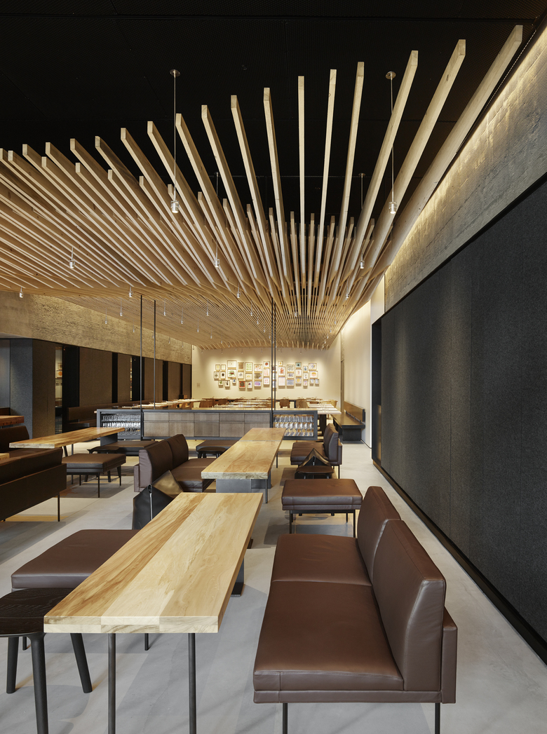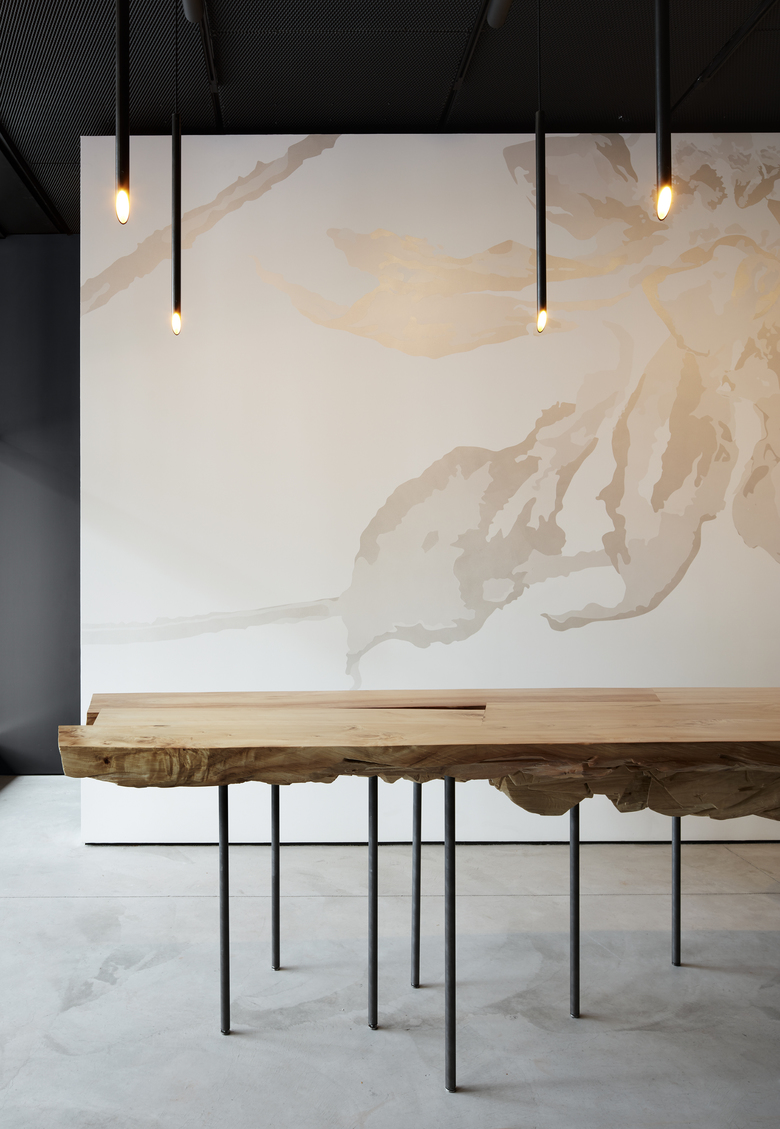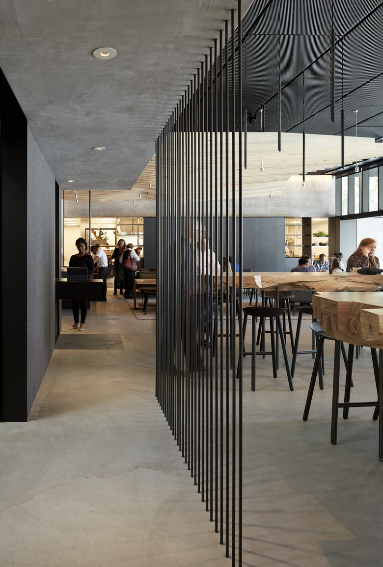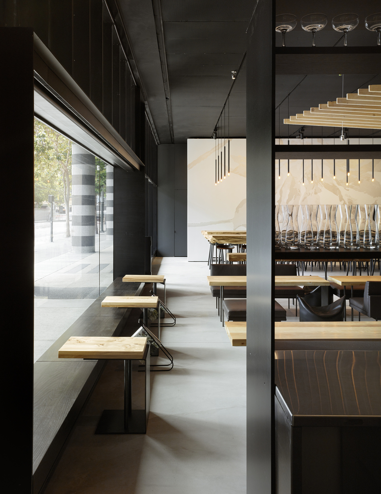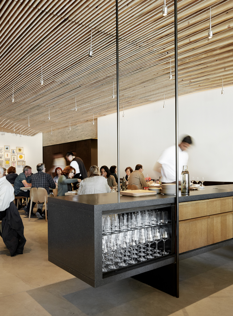 Inhabiting street-front space in the existing shell of the Mario Botta-designed portion of the reopened SFMoMA, the interior volume of the previous museum café was excavated and left raw and exposed. Inserted in to this excavation is an interplay of floating white art walls, carefully placed to bracket space within the larger expanse of the restaurant. Steel apertures and felt acoustic panels calibrate zones of passage, both visual and physical, between the street and the restaurant, as well between the restaurant and museum’s atrium. Together with the raw shell, these layers create a backdrop for discreetly placed “artifacts”, analogous to ingredients in their various states of refinement, strategically employed to engage the guest’s physical experience. All were inspired thru a collaborative process with the intent of drawing contrast between the rough and the refined: custom designed lighting, custom furniture and a sculptural wood ceiling.