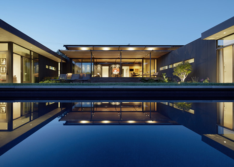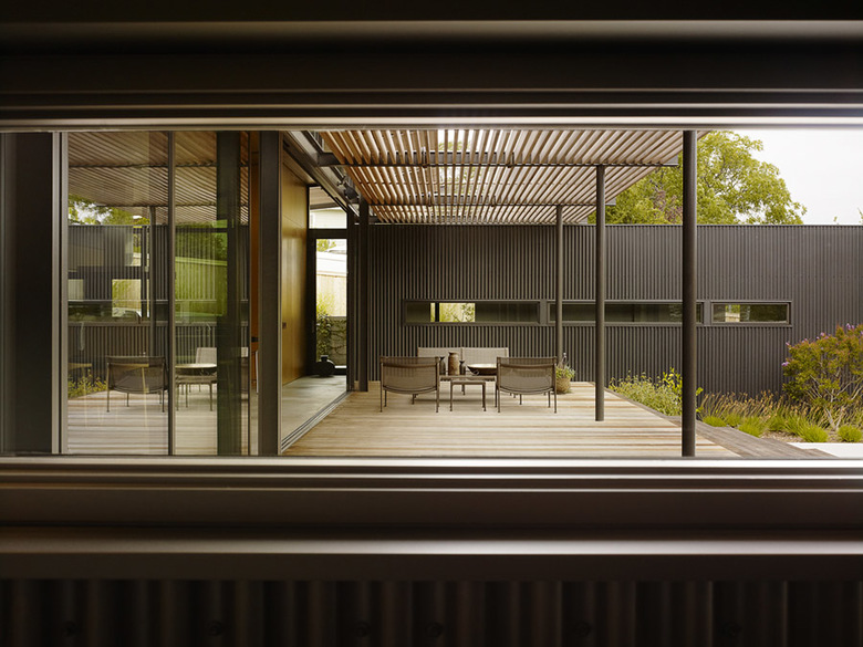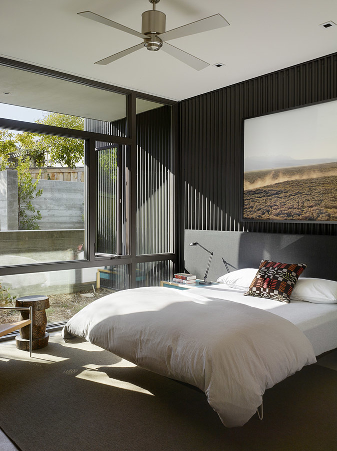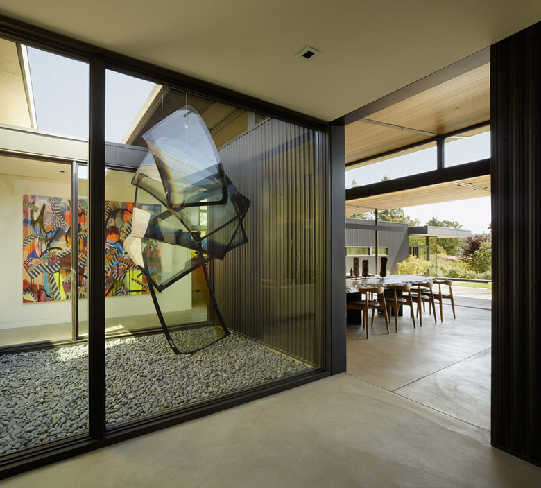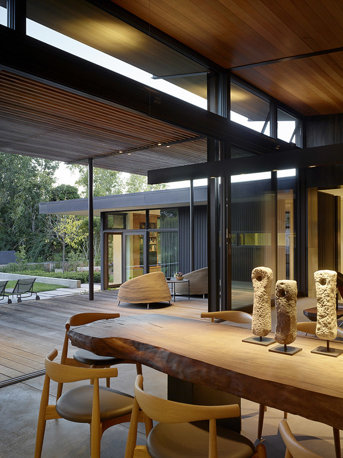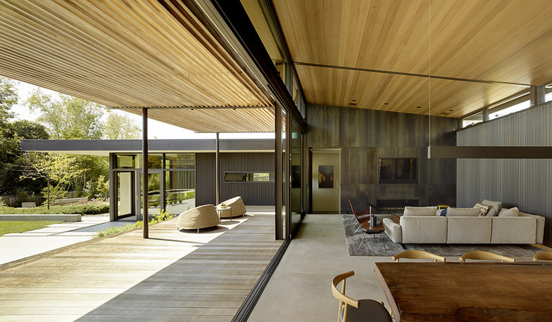 The material palette integrates industrial materials, such as corrugated metal siding, patinated raw plate steel, and concrete floors, that are complemented by the warmth of wood ceilings, cabinets, decks and trellises. The result is an architecture of material simplicity, that focuses on space, texture, and natural light. This quiet palette also provides an intentionally neutral backdrop for the client's growing art collection. The ultimate goal is a home that lives effortlessly while unifying an experience of art and nature.