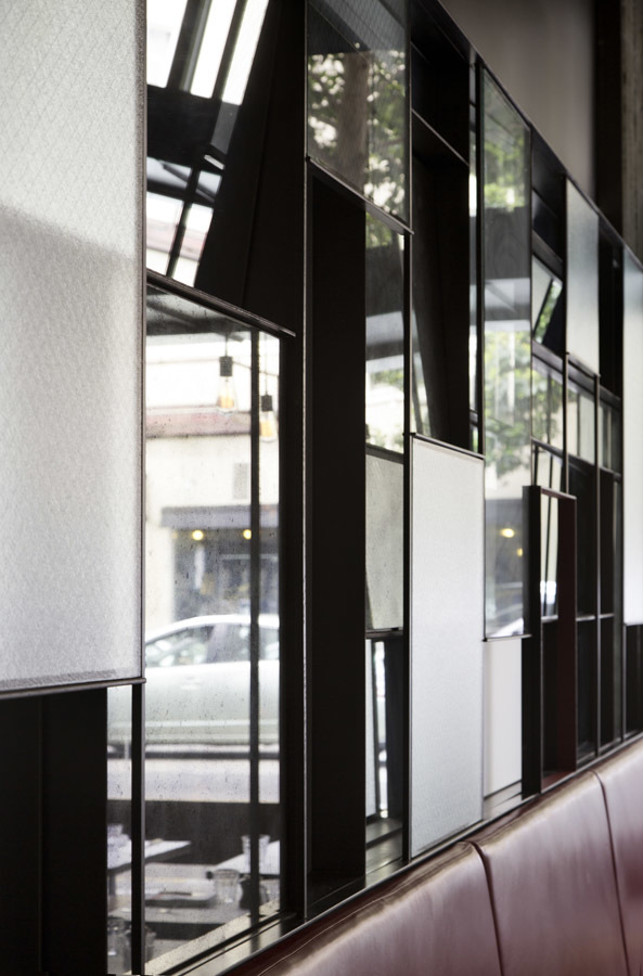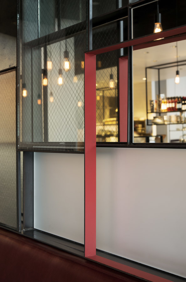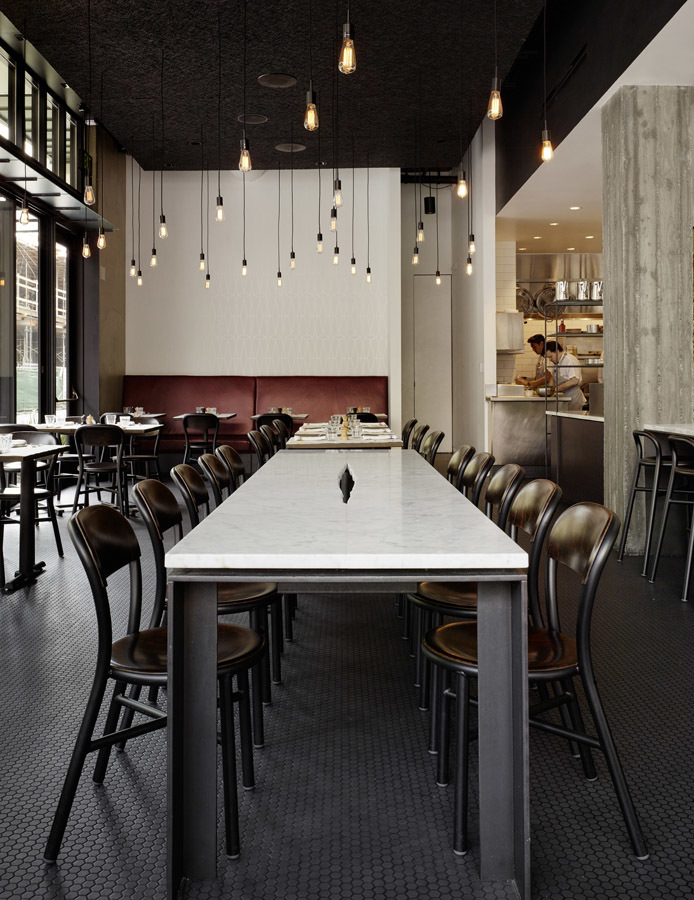 The dining room is separated into two spaces by a bar of dark oak, marble, and steel, that acts as the restaurant’s hub. Guests can see the bar and into the kitchen through a furniture-like veil of steel, glass and wood once they enter. This furniture like piece is multi-functional in that it includes storage and provides guests with subtle separation and a place to set a drink while they wait for their table. To the south of the bar is a dining space that seamlessly connects to the street and outdoors dining space. It includes a marble communal table and a low counter that can be used for dining at the bar. To the north is a more intimate dining space with a mosaic of steel, glass and mirror. Both dining spaces include a street-front banquette of dark red leather with a sculptural heavy timber seat back that floats in the window. Materials and elements are intended to pay homage and make subtle reference to the utility and comfort of the traditional bistro typology, while resonating with its urban context.