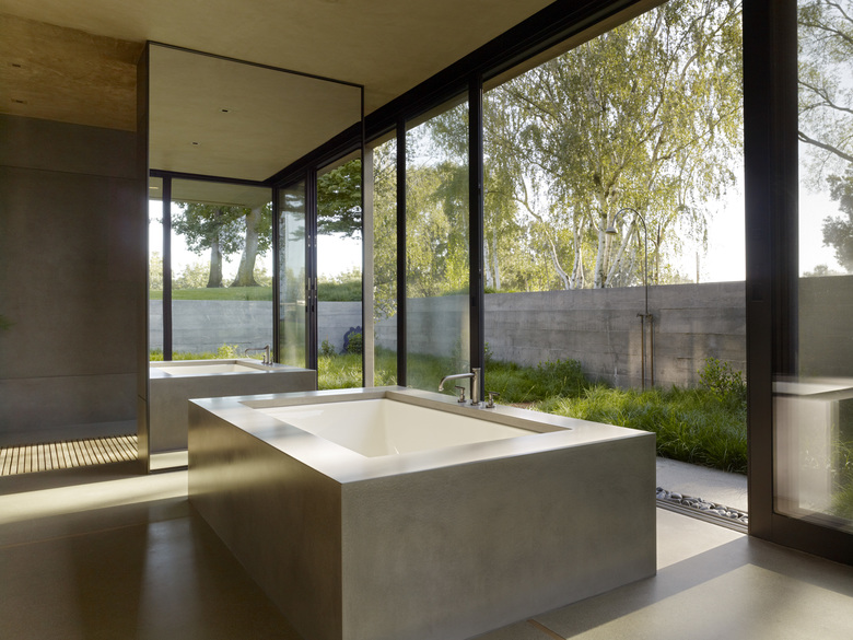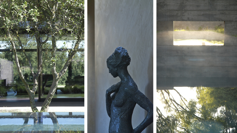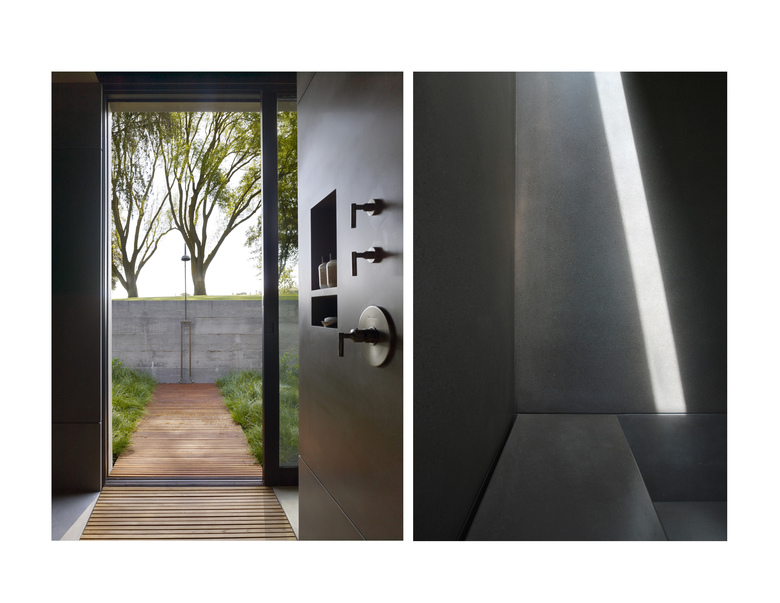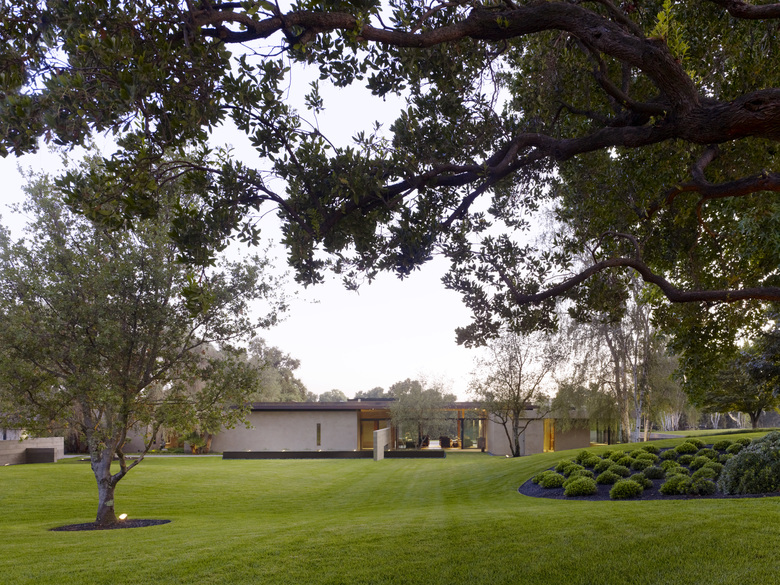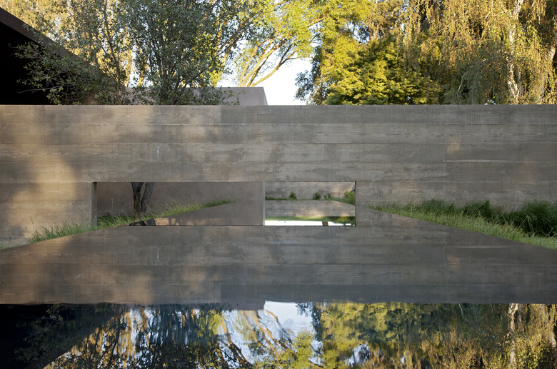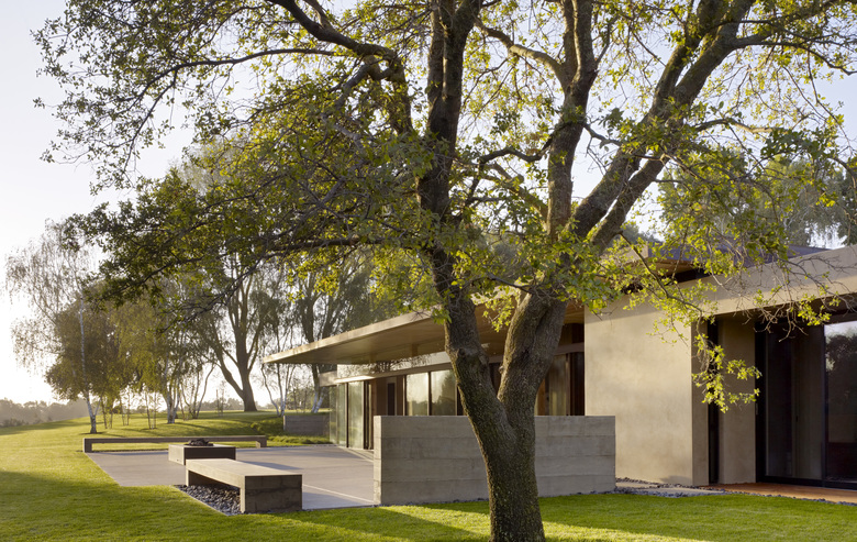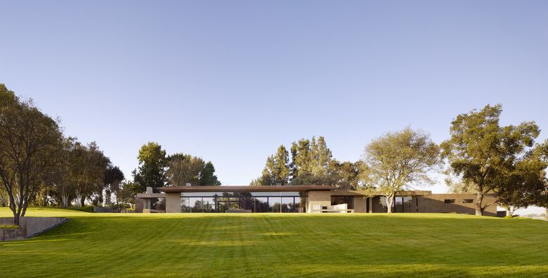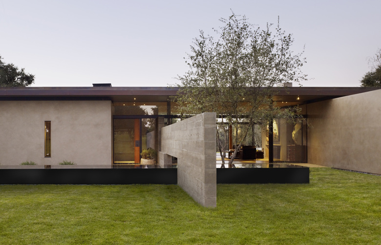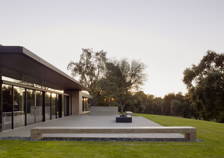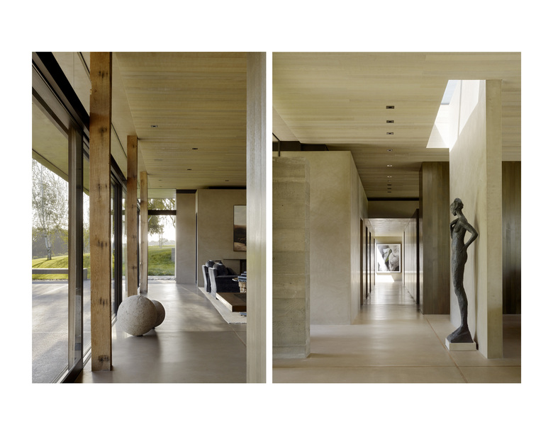Situated in the rural "Big Valley" of Central California, this private residence negotiates between the rigid geometry of its agricultural context on one side, and the serene pastoral setting of a natural stream basin on the other. Inspired by the paintings of Giorgio de Chirico, simple forms cast in strong daylight and shadow capture a spirit of place. Heavy earthen masses are collected under a broad overhanging roof plane, composed to bracket the landscape and reciprocate the grand scale of the site. The resulting interstitial void demarcates the public living zone as an indoor/outdoor room, blurring distinctions between interior and exterior space. Intimate sleeping and bathing spaces are placed within the earthen masses, each with its own private access to an outdoor garden room. A rustic vocabulary was developed in response to the agricultural vernacular, resulting in a neutral palette of cement plaster, reclaimed wood posts and planks, steel, board formed concrete, and water elements.