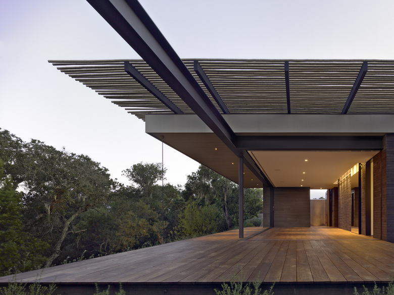 The building’s form is defined by a collection of simple rustic cedar boxes that provide a counterpoint to the surrounding landscape. The rectilinear forms are in turn cradled by the curving walls, which allow the resultant space to burrow into the earth. The wood deck of reclaimed teak extends interior space out into the landscape, obscuring the boundaries between inside and outside. A canopy of cantilevered lodgepole pine floats above the roof, providing much needed shade to the southern face of the building and its’ sundeck.