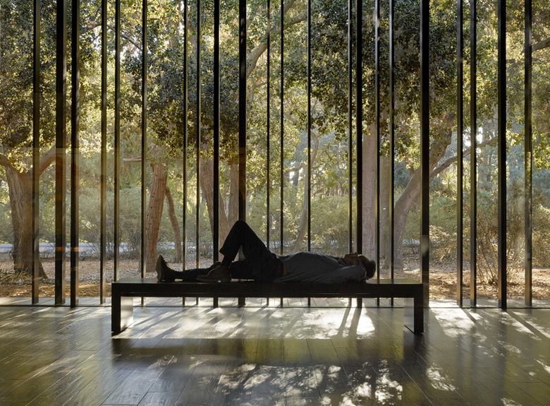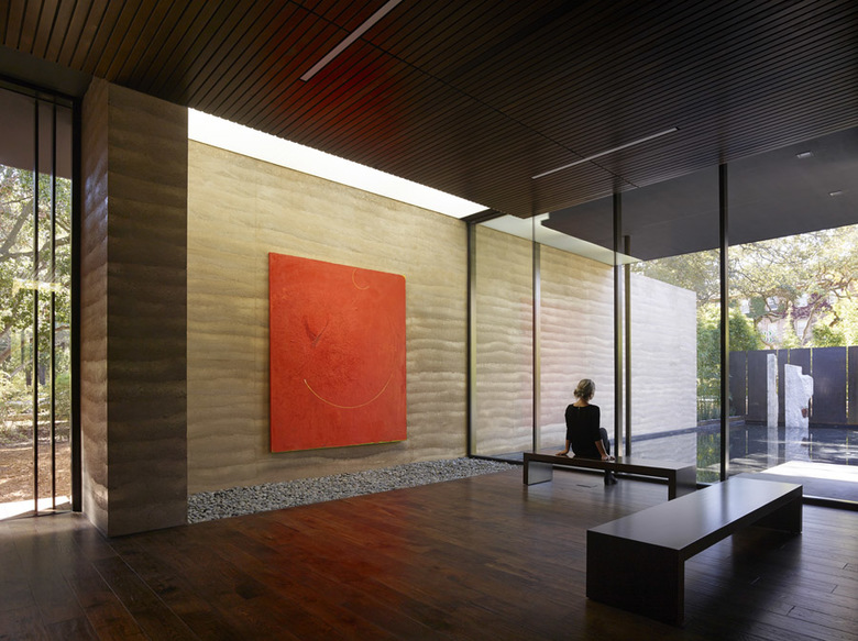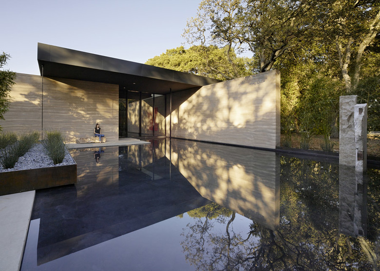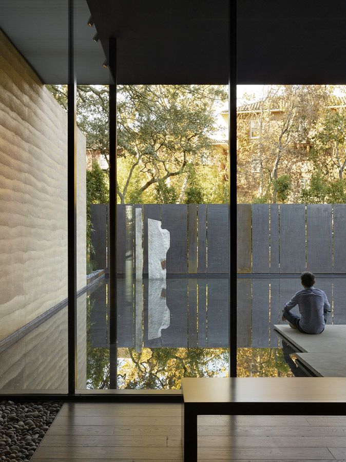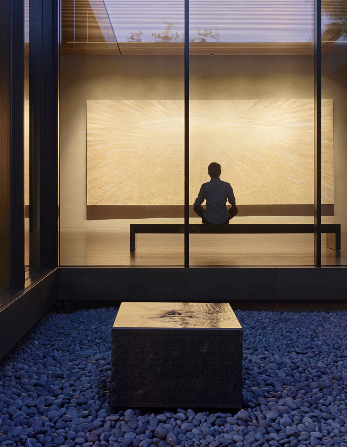 Water, in conjunction with landscape, is used throughout as an aid for contemplation; fountains within the main gallery and the courtyard provide ambient sound while a still reflecting pool to the south reflects the surrounding trees. Exterior contemplation spaces are integrated into the use of the center, allowing views to the natural surroundings as well as to the paintings within. From the oak grove to the east, visitors can view the paintings glowing within the center without accessing the building, effectively creating a sanctuary for the Stanford community day and night.