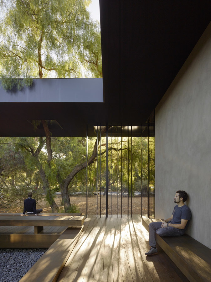 The sanctuary is located in the heart of the campus, adjacent to a natural oak grove. The extended progression to the building’s entry through a long, private garden sheltered from its surroundings by a line of tall bamboo allows visitors to shed the outside world before entering the sanctuary. Within, the space opens fully to the oak grove to the east and the Papua New Guinea Sculpture Garden beyond.