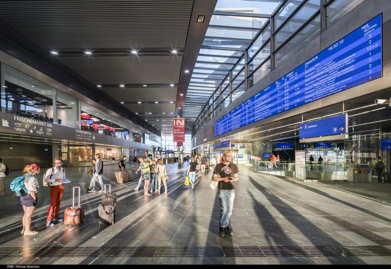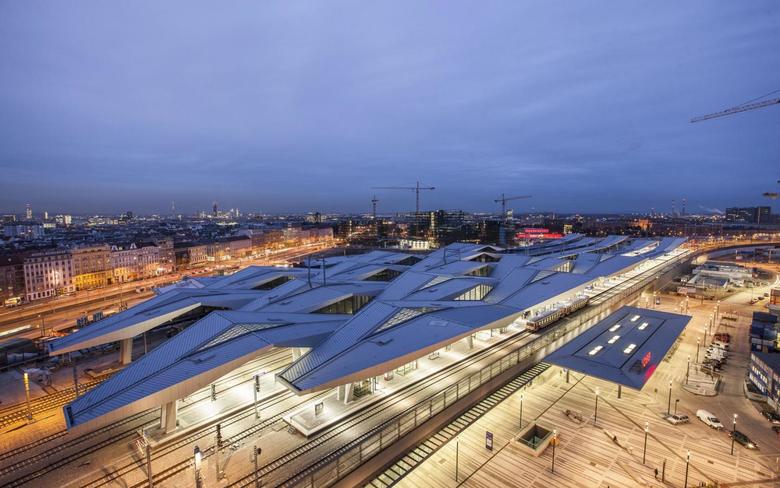 Das markante Dach der neuen Verkehrsstation repräsentiert mit ihrer harmonischen Gestalt, ihrem Rhythmus und Schweben die Welt- und Musikstadt Wien. Das Dach ist in fünf lange und jeweils bis zu fünf Mal geknickte Parallelbahnen aufgeteilt. Sie liegen auf schrägen, in 40 m-Abstand positionierten Doppelstützen-Stahlböcken. Die Länge eines Rautentisches beträgt 80m. Dort, wo eine Dachbahn nach oben geknickt ist, wurde die benachbarte nach unten gefaltet. Durch diese Versetzung entstehen rautenähnliche, verglaste Öffnungen zwischen „Wellenbergen“ (Firsten) und „Tälern“ (Traufen). In mehrfacher Hinsicht wird so das Rautenmotiv horizontal und vertikal variiert, was einen dynamischen Eindruck erzeugt. Durch den Einsatz von Glaselementen wird es möglich, Tageslicht bis hinunter in die Tiefgaragenebene zu leiten. Besonderes Augenmerk wurde auch auf die Gestaltung der Vorplätze gelegt, um Orientierung und Übersichtlichkeit zu schaffen. Gemeinsam mit den insgesamt fünf neuen Unter- und zwei Überführungen (Arsenalsteg und Südbahnhofbrücke) sorgen die Vorplätze für eine dynamische Durchwegung des Areals.