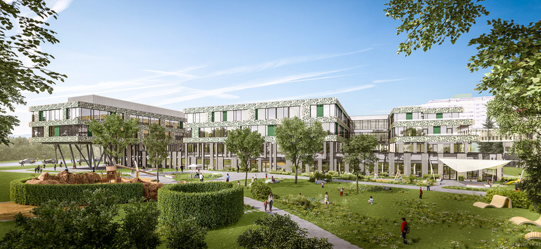 Durch die städtebauliche Setzung der Baukörper entsteht ein fließender Landschaftsraum rund um die neue Kinder- und Jugendklinik, der in den fünf begrünten Innenhöfen eine Fortsetzung findet. Inmitten der bestehenden Parkanlage werden neue Gärten und Erlebniszonen errichtet, die den unterschiedlichen Ansprüchen von Kindern und Jugendlichen gerecht werden.
