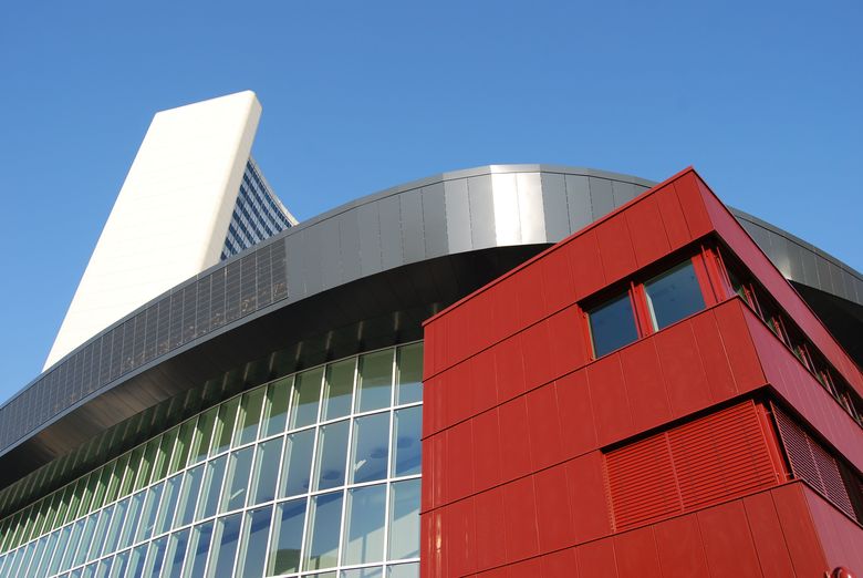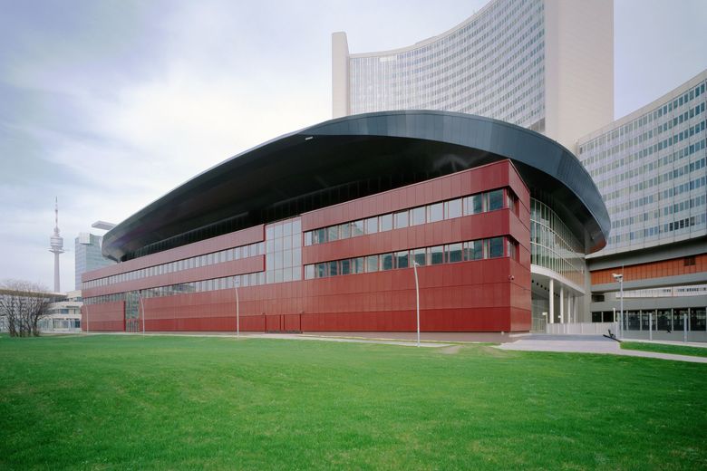 Der wahre Blickfang liegt jedoch im Inneren: mit ablesbaren Rampen, Stiegen und Foyers sowie lichtdurchlässigen Sichtachsen werden die funktionell erforderlichen Anbindungen an das Herzstück, die Konferenzräume, verdeutlicht. Die Grundkonzeption wird von der Prämisse des Sichtbarmachens der Bewegungsflüsse bestimmt: Ein kompakter Kern, die klare Trennung des Verwaltungs- und Konferenzbetriebes sowie die Übersichtlichkeit der Foyerzonen garantieren maximale Orientierung und reibungslose Abläufe.