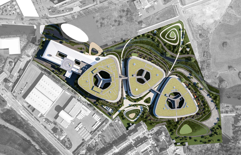 Der landschaftsarchitektonische Entwurf sieht die Schaffung eines lebendigen, harmonischen und ineinanderfließenden Wohlfühlraums vor. Der Freiraum ist in drei Themen gegliedert: die inneren Höfe des Krankenhauses, der Gesundheitspark mit seinen belebten, urbanen Grünoasen entlang der Wasserader sowie die begrünten Dächer. Diese drei Bereiche sind durch ein durchgängiges Netz aus Wegen und Verbindungen eng miteinander verbunden. Ergänzt wird das „healing environment“ durch den Einsatz natürlicher Formen, von naturnahen „healing colours“ sowie einer Auswahl von geeigneten Kunstwerken. In Verbindung mit dem Grünraum und den eigens konzipierten Gärten und Dachlandschaften entsteht ein gesamtheitlich-räumliches Empfinden, das wesentlich zum Wohlfühlen und zum Genesungsprozess beiträgt.