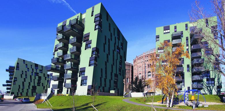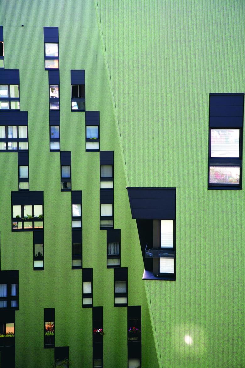 Die Stadtvillen suchen tanzend die optimale Position, was die Besonnung und Sichtqualität betrifft, aber auch in Bezug auf den neugestalteten Park. Eine gemeinsame Sprache in Form und Material erzeugt Quartiersidentität, die Bewohner fühlen sich vertraut, Zufriedenheit prägt den Umgang mit dem Wohn- und Lebensumfeld. Die fünf selbstständigen, monolithen Baukörper erfahren durch die naturgrüne Fassadenhaut in Form einer hochwertigen Wellblechverkleidung eine plastische Ausformulierung und Zonierung. Die hinterlüftete Fassade verhindert Bauschäden durch Dampfkondensation. Die farbstabile, langlebige Beschichtung macht eine recycelbare und praktisch wartungsfreie Fassade möglich - das System ist bis zum Passivhausstandard ausbaubar.