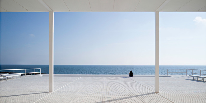 Constructed as if it were a ship, it is painted completely white to accentuate its lightness. The paved area is carpeted in white marble.