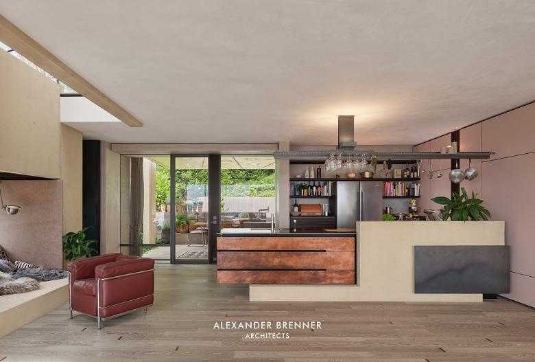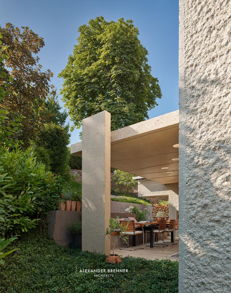 Vom Hochbau über alle Einbauten, Möbel und Leuchten bis hin zu den Türgriffen wurde das Haus bis zum kleinsten Detail als ein Gesamtwerk geplant und realisiert. Auch die Aussenanlagen und der Garten stammen aus der Feder des Architekten.