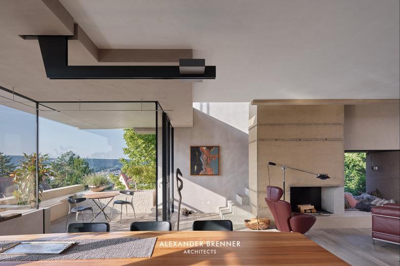 Oberlichte und die grosszügigen, rahmenlosen Verglasungen zur Talseite verwischen die Grenzen zu den vorgelagerten Terrassen und schaffen vielschichtige und lichtdurchflutete Innenräume.