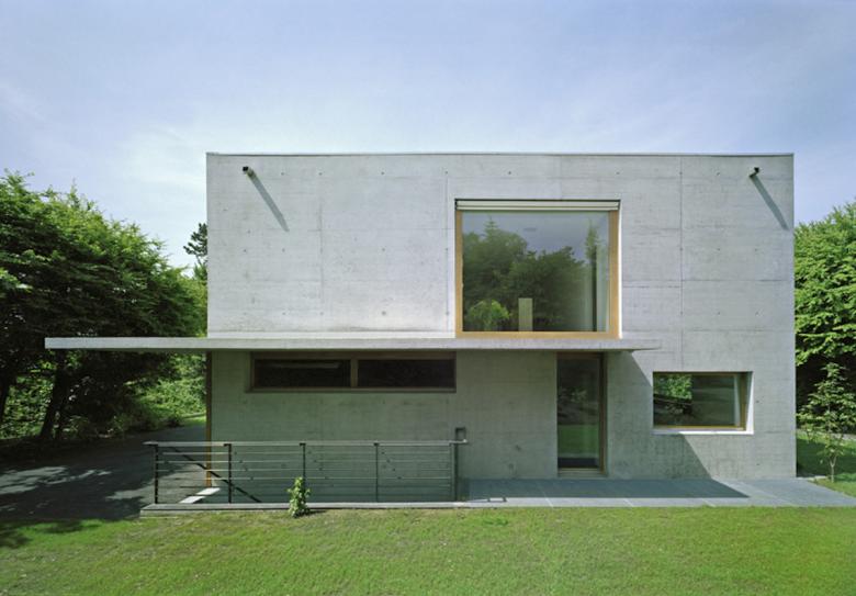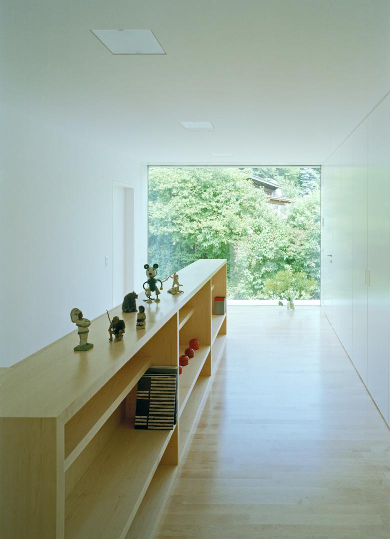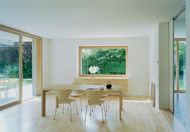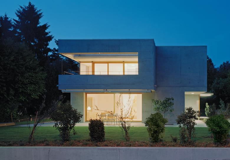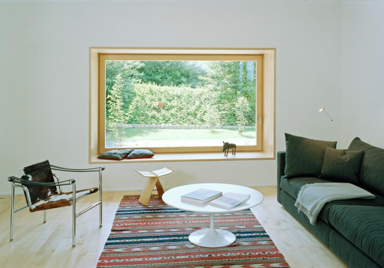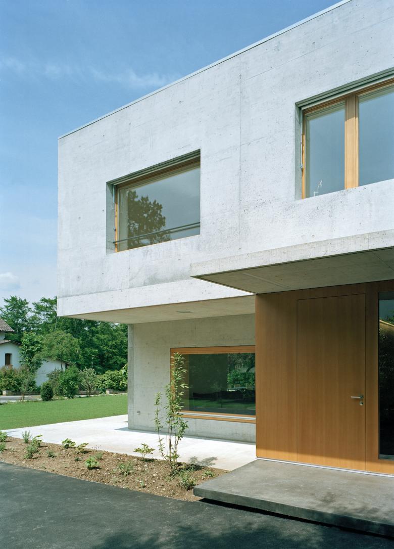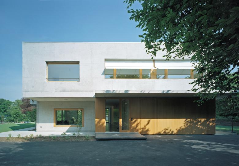 Der helle Sichtbetonbau mit Holzfenstern und Holzgaragentor weist klare Linien auf. Die präzise eingesetzten Fenster rahmen die Fernsicht, den Garten und die Baumkronen so, dass man die umliegenden Häuser des Einfamilienhausquartiers nicht wahrnimmt.
