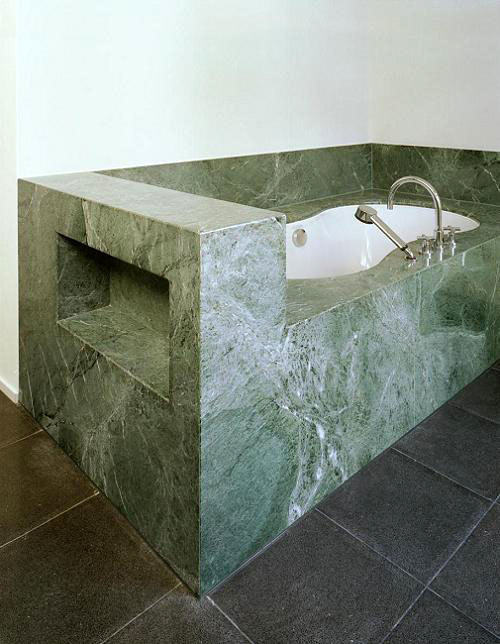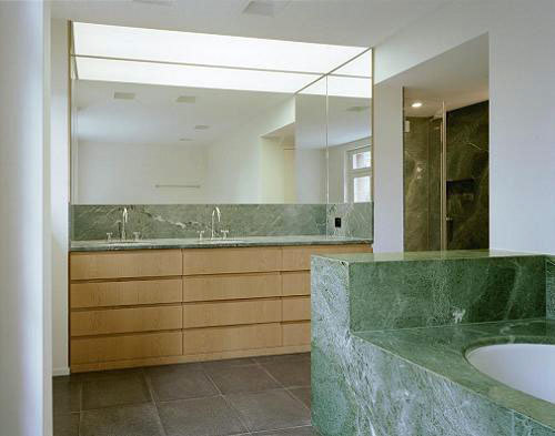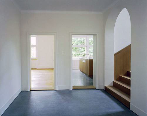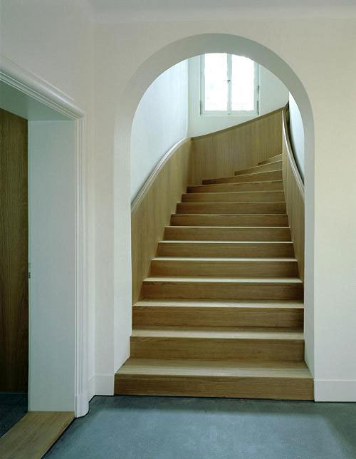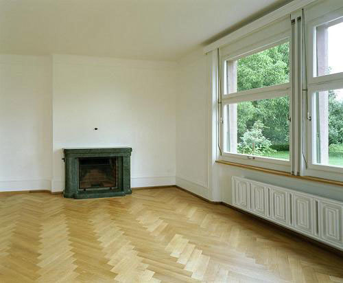 Beim Innenausbau verwendeten wir ausschliesslich im Haus bereits vorkommende Materialien. So wurde z.B. die repräsentative Treppe ins Obergeschoss in geölter Eiche mit modernen Details an ursprünglicher Lage eingebaut. Die Böden des Eingangsbereichs, der Küche, der Bäder und der Veranda erhielten Terrazzobeläge und die Wände der Bädern grossformatigen Natursteinplatten - alles Materialien, welche bereits 1928 im Haus verwendet wurden. Auch die Holzeinbauten in geölter Eiche greifen den Charakter der alten Substanz wieder auf.